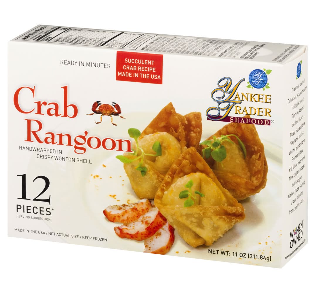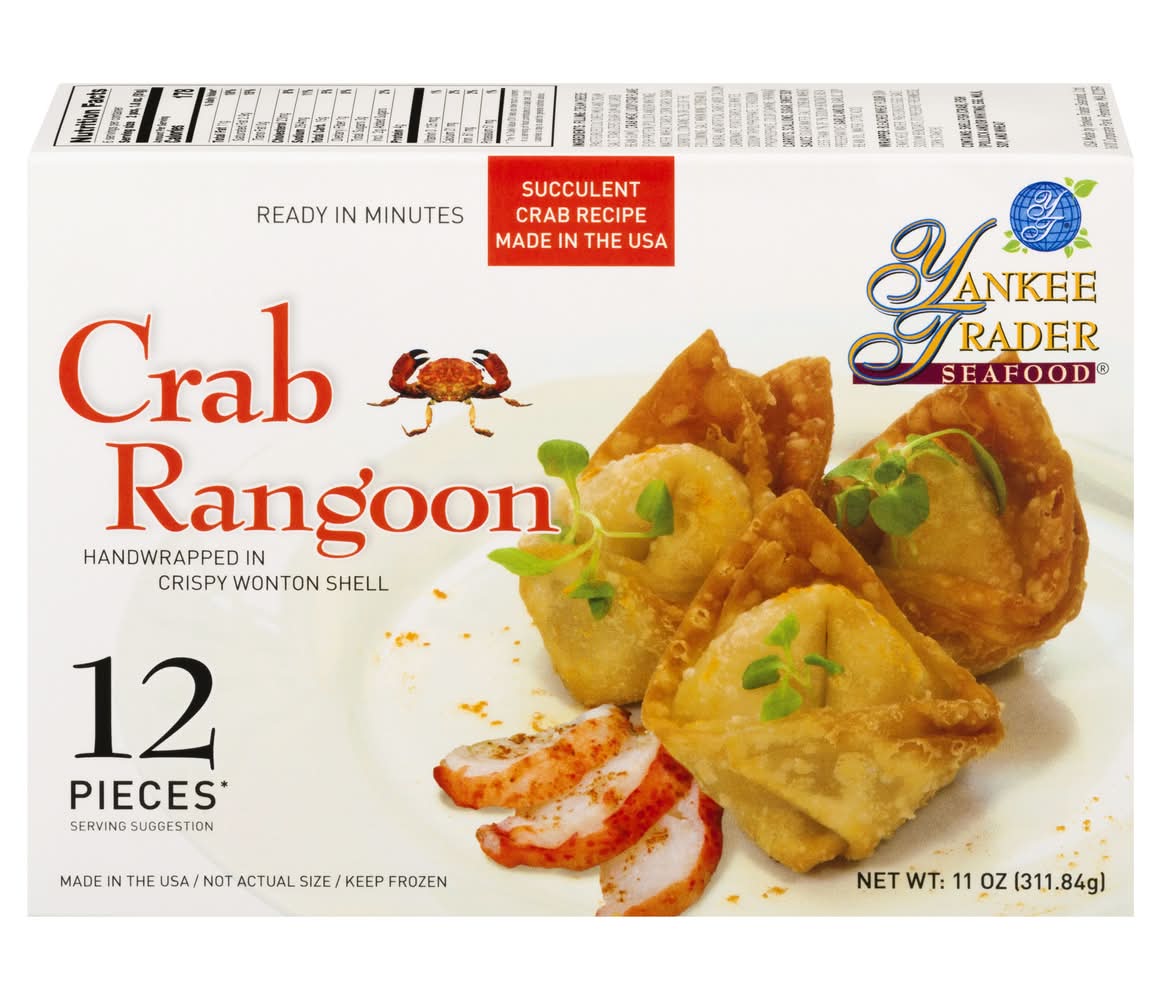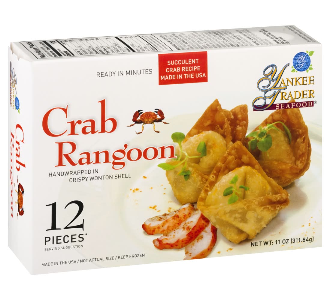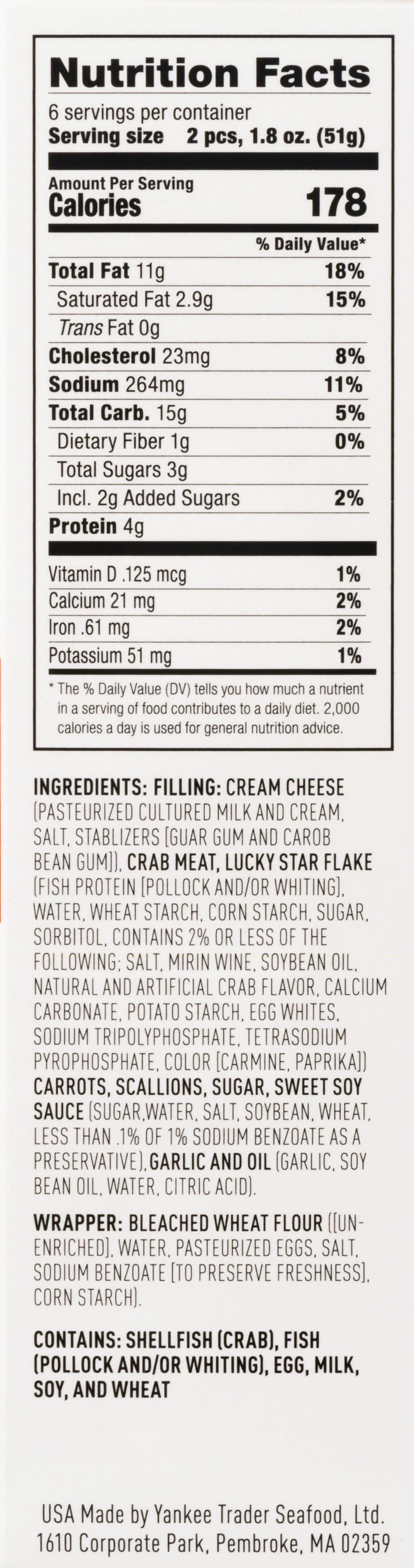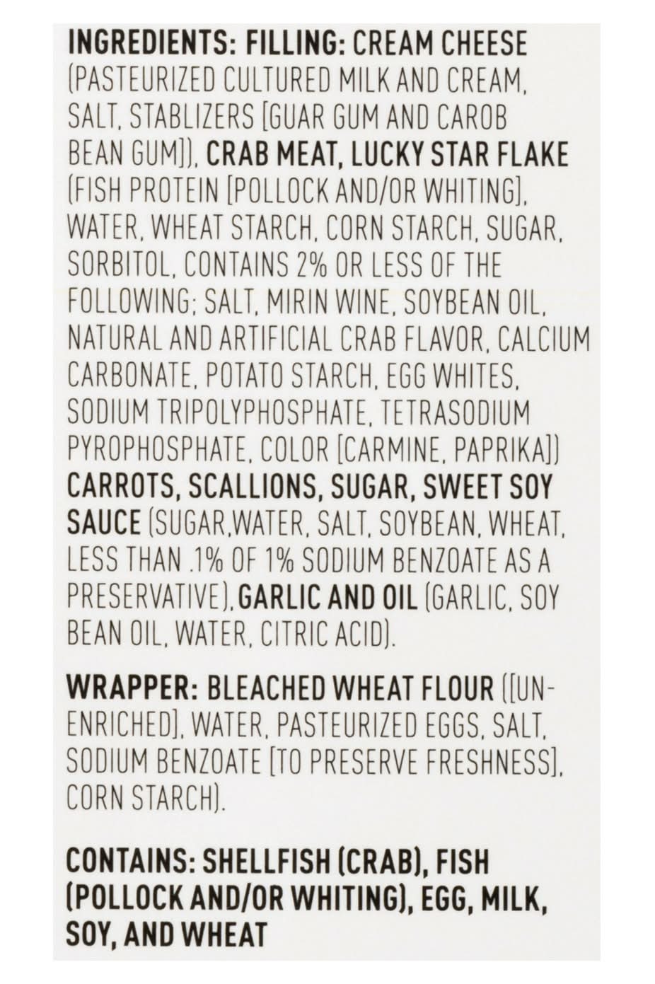 Ingredients: Filling: Cream Cheese (Pasteurized Cultured Milk and Cream, Salt, Stablizers [Guar Gum and Carob Bean Gum]), Crab Meat, Lucky Star Flake (Fish Protein [Pollock and/or Whiting], Water, Wheat Starch, Corn Starch, Sugar, Sorbitol, Contains 2% or Less of the Following; Salt, Mirin Wine, Soybean Oil, Natural and Artificial Crab Flavor, Calcium Carbonate, Potato Starch, Egg Whites, Sodium Tripolyphosphate, Tetrasodium Pyrophosphate, Color [Carmine, Paprika)] Carrots, Scallions, Sugar, Sweet Soy Sauce (Sugar, Water, Salt, Soybean, Wheat, Less than 1% of 1% Sodium Benzoate as a Preservative), Garlic and Oil (Garlic, Soy Bean Oil, Water, Citric Acid). Wrapper: Bleached Wheat Flour ([Unenriched], Water, Pasteurized Eggs, Salt, Sodium Benzoate [to Preserve Freshness], Corn Starch) Contains: Crustacean Shellfish, Fish, Milk, Wheat, Soybeans, Eggs
