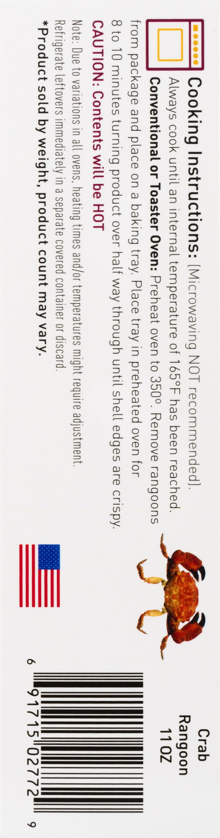 Directions for use: Cooking Instructions: (Microwaving not recommended). Always cook until an internal temperature of 165 degrees F has been reached. Conventional or Toaster Oven: Preheat oven to 350 degrees. Remove rangoons from package and place on a baking tray. Place tray in preheated oven for 8 to 10 minutes turning product over half way through until shell edges are crispy. Caution: Contents will be hot. Note: Due to variations in all ovens, heating times and/or temperatures might require adjustment. Refrigerate leftovers immediately in a separate covered container or discard. Keep frozen. Storage recommendation: Keep frozen.