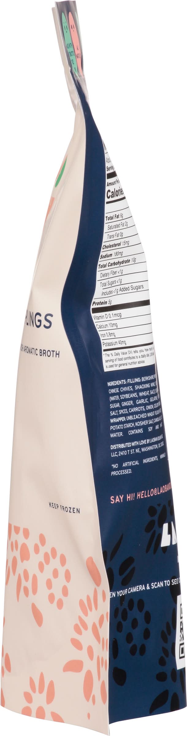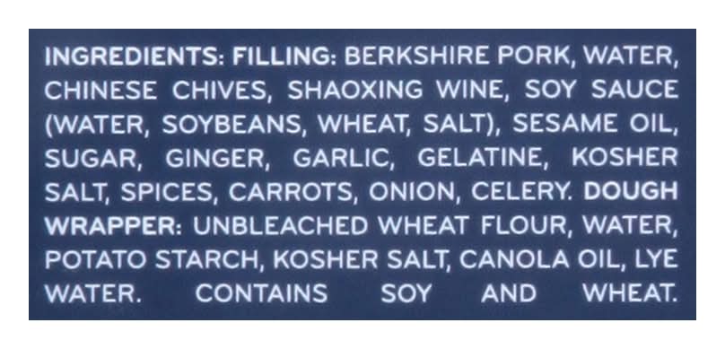 Ingredients: Filling: Berkshire Pork, Water, Chinese Chives, Shaoxing Wine, Soy Sauce (Water Soybeans Wheat Salt), Sesame Oil, Sugar, Ginger, Garlic, Gelatine, Kosher Salt, Spices, Carrots, Onion, Celery. Dough Wrapper: Unbleached Wheat Flour, Water, Potato Starch, Kosher Salt, Canola Oil, Lye Water Contains: Soybeans, Wheat, Sesame, Celery