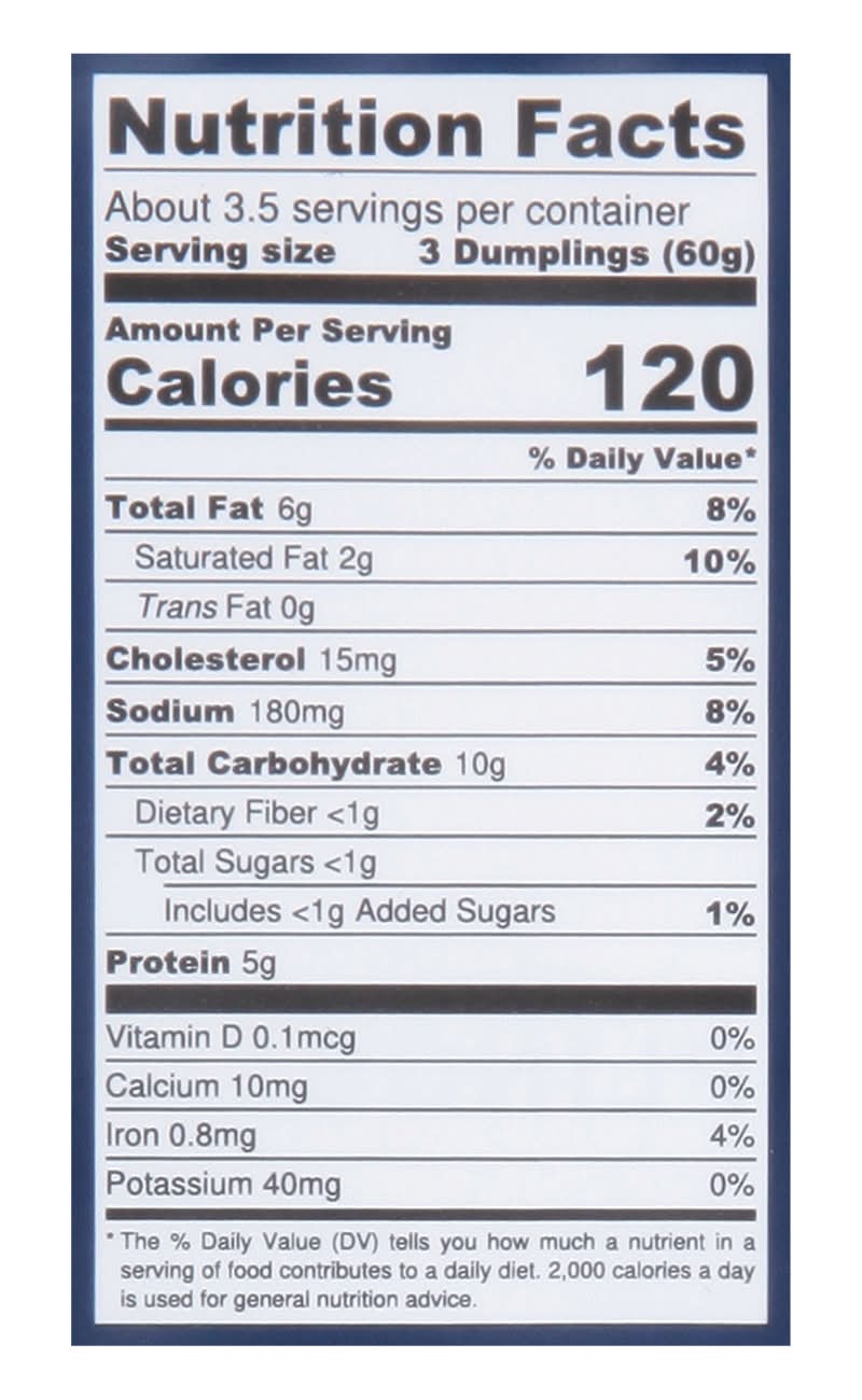 Directions for use: Directions: Safe Handling Instructions: This product was prepared from inspected and passed meat and/or poultry. Some food products may contain bacteria that could cause illness if the product is mishandled or cooked improperly. For your protection, follow these safe handling instructions. Keep refrigerated or frozen. Thaw in refrigerator or microwave. Keep raw meat and poultry separate from other foods. Wash working surfaces (including cutting boards), utensils, and hands after touching raw meat or poultry. Cook thoroughly. Keep hot foods hot. Refrigerate leftovers immediately or discard. Cooking Instructions: Steamed: Bring water to a rolling boil. Line steamer with parchment paper or oil. Place dumplings on steamer and steam for 8 min. Pan-Fried: 1. Heat 2 tbsp oil in pan over medium-high heat, place dumplings in pan. 2. Add enough water to cover dumplings halfway up, cover and cook for 5 mins. 3. Remove cover and keep cooking till water evaporates & bottoms are brown, about 5 mins. Keep frozen. Storage recommendation: Keep frozen.