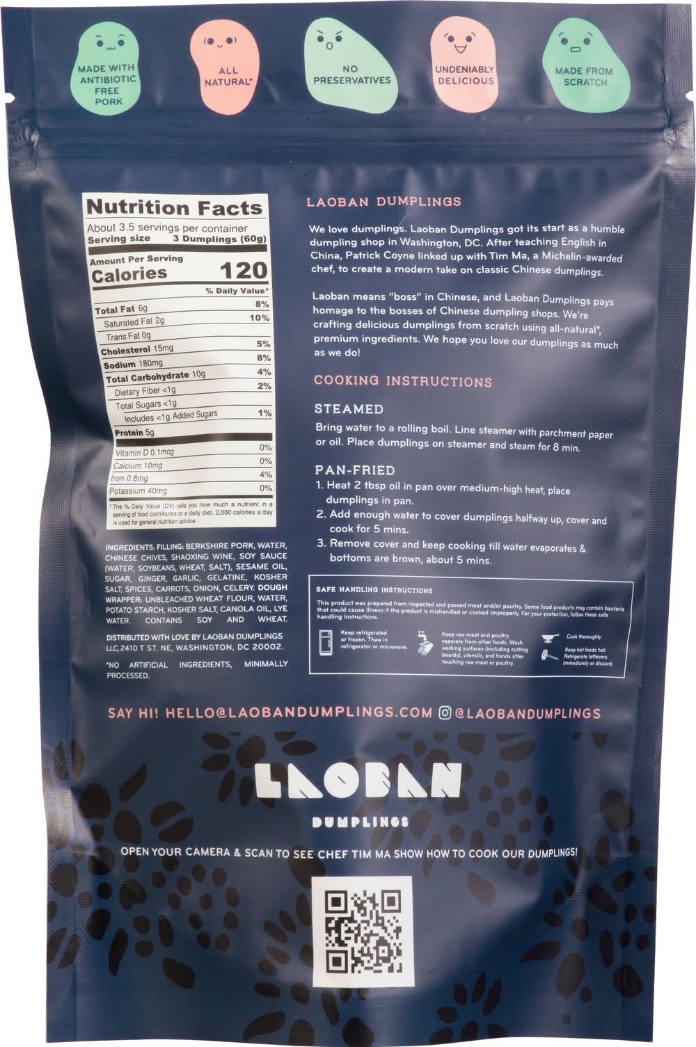 Berkshire pork, Chinese chives, rich aromatic broth. No preservatives. All natural (No artificial ingredients, minimally processed). Undeniably delicious. Made from scratch. We love dumplings. Laoban Dumplings got its start as a humble dumpling shop in Washington, DC. After teaching English in China, Patrick Coyne linked up with Tim Ma, a Michelin-awarded chef, to create a modern take on classic Chinese dumplings. Laoban means boss in Chinese, and Laoban Dumplings pays homage to the bosses of Chinese dumpling shops. We're crafting delicious dumplings from scratch using all-natural (No artificial ingredients, minimally processed), premium ingredients. We hope you love our dumplings as much as we do! U.S. inspected and passed by Department of Agriculture. Say hi! hello(at)laobandumplings.com. Instagram. (at)laobandumplings. Open your camera & scan to see chef Tim Ma show how to cook our dumplings!