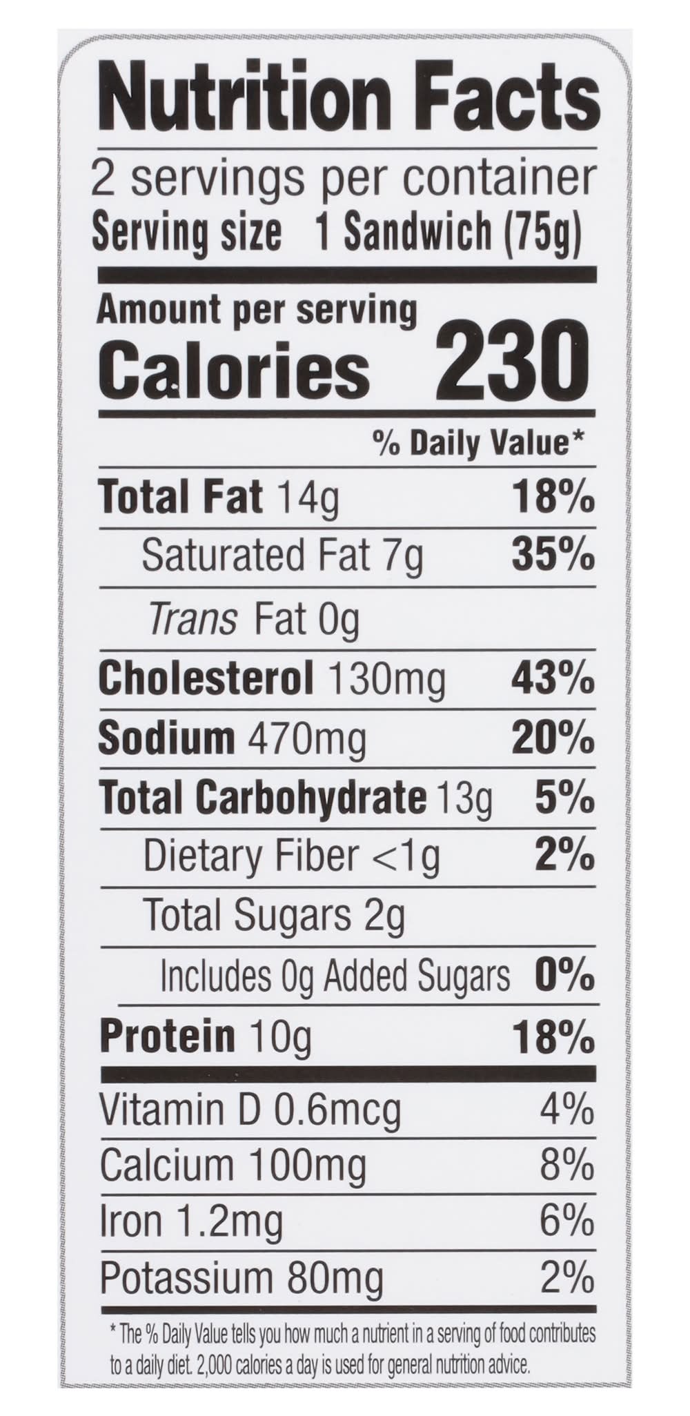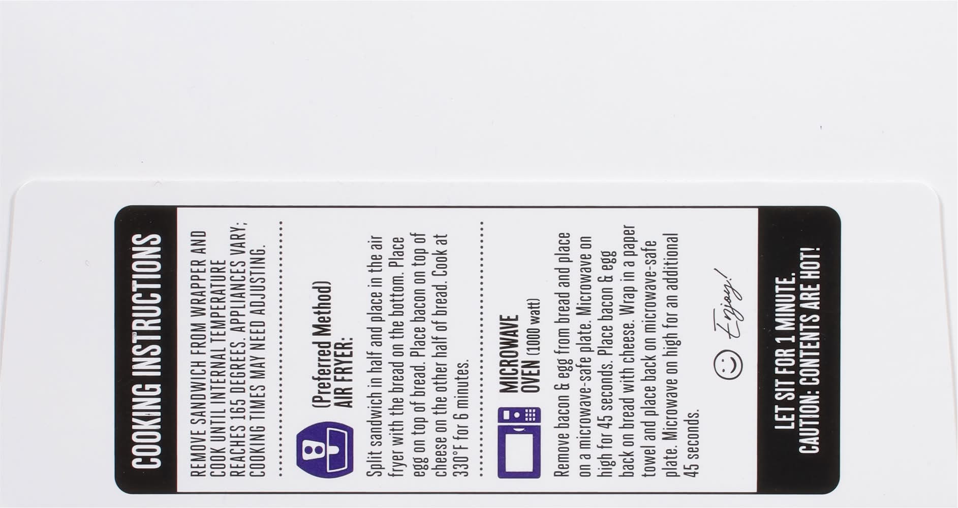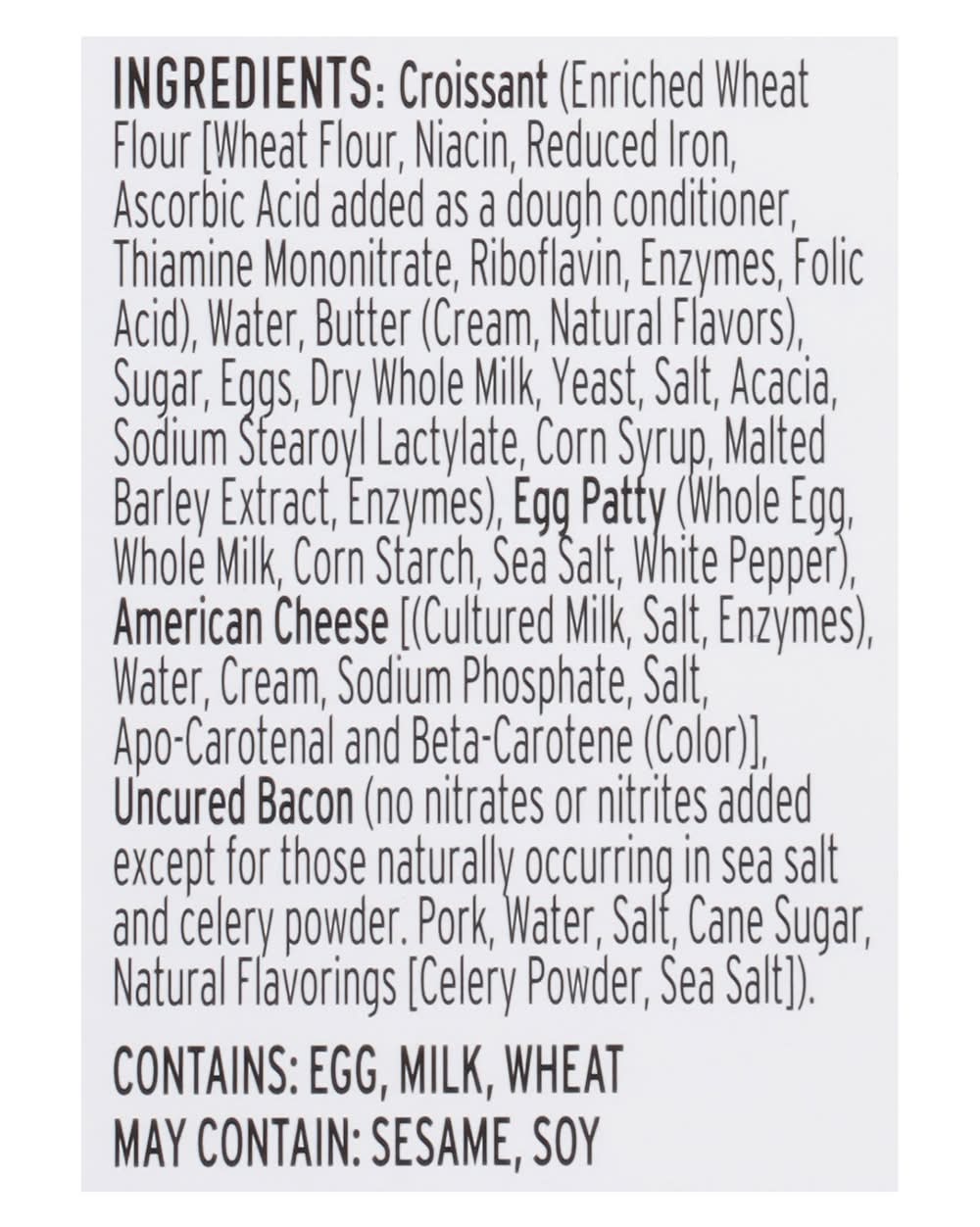 Ingredients: Croissant (Enriched Wheat Flour [Wheat Flour, Niacin, Reduced Iron, Ascorbic Acid Added as a Dough Conditioner, Thiamine Mononitrate, Riboflavin, Enzymes, Folic Acid), Water, Butter (Cream, Natural Flavors), Sugar, Eggs, Dry Whole Milk, Yeast, Salt Acacia, Sodium Stearoyl Lactylate, Corn Syrup, Malted Barley Extract Enzymes), Egg Patty (Whole Egg, Whole Milk, Corn Starch, Sea Salt, White Pepper), American Cheese [(Cultured Milk Salt, Enzymes), Water, Cream, Sodium Phosphate, Salt, Apo-Carotenal and Beta-Carotene (Color)), Uncured Bacon (No Nitrates or Nitrites Added Except for Those Naturally Occurring in Sea Salt and Celery Powder, Pork Water, Salt, Cane Sugar, Natural Flavorings [Celery Powder, Sea Salt)) Contains: Eggs, Milk, Wheat, Barley, Celery, Corn, Sesame, Soybeans
