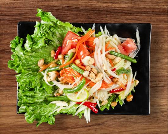 Famous Thai papaya salad - Fresh Green Papaya, Peanuts, green beans, tomato, dried shrimp tossed in Sweet - Fresh Lime Dressing *Can’t be made without Fish sauce