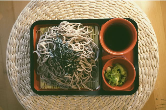 Buckwheat Soba served cold and dipping sauce Tsuyu, scallion, seaweed, and daikon, wasabi.