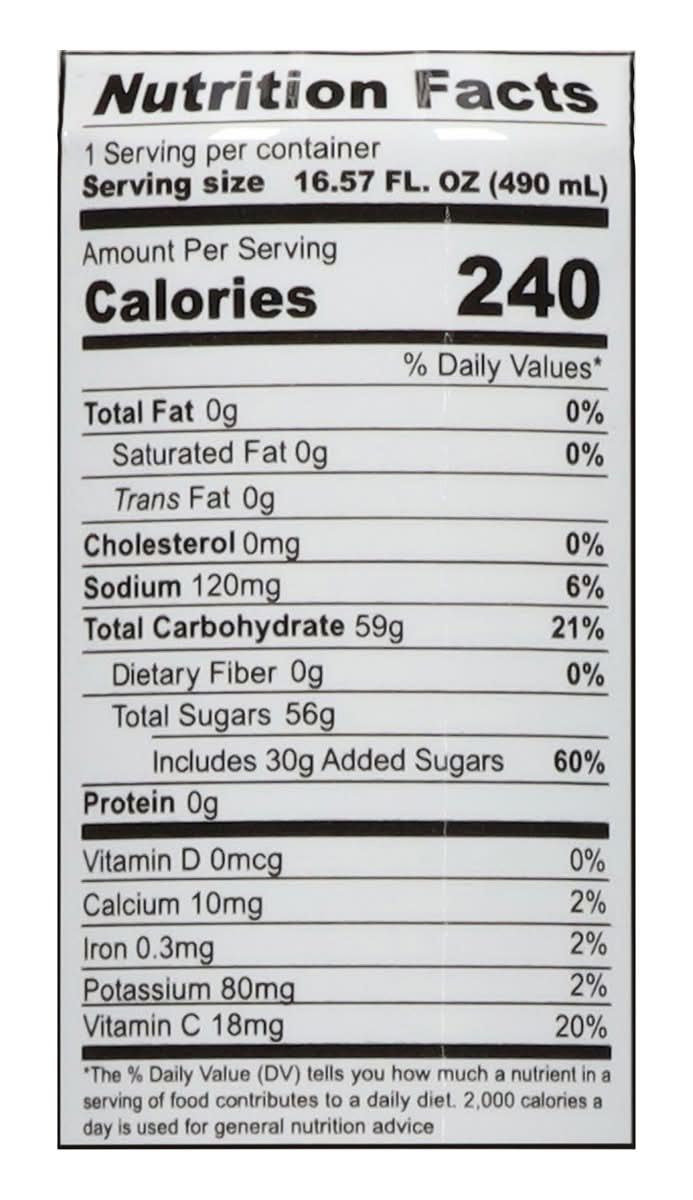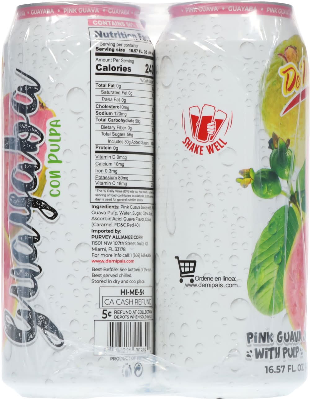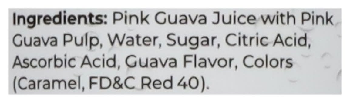 Ingredients: Pink Guava Juice with Pink Guava Pulp, Water, Sugar, Citric Acid, Ascorbic Acid, Guava Flavor, Colors (Caramel, FD&C Red 40)