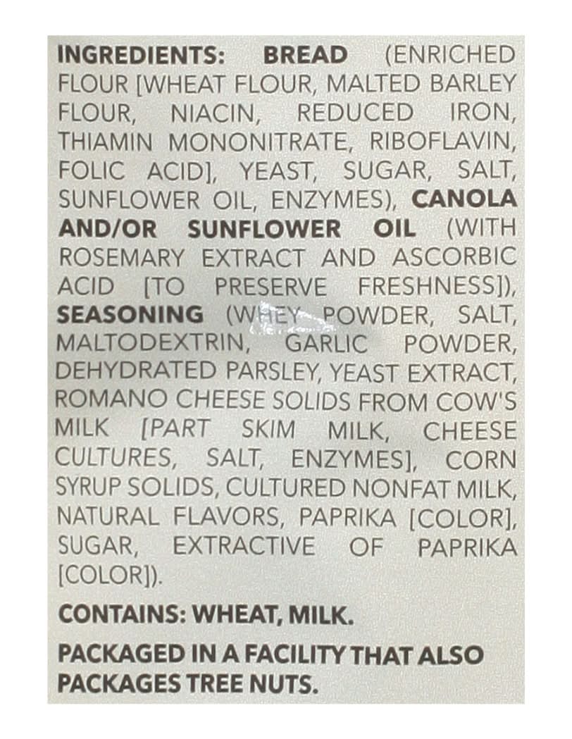 Ingredients: Bread (Enriched Flour [Wheat Flour Malted Barley Flour Niacin Reduced Iron Thiamin Mononitrate Riboflavin Folic Acid] Yeast Sugar Salt Sunflower Oil Enzymes), Canola and/or Sunflower Oil (with Rosemary Extract and Ascorbic Acid [to Preserve Freshness]), Seasoning (Whey Powder Salt Maltodextrin Garlic Powder Dehydrated Parsley Yeast Extract Romano Cheese Solids from Cow's Milk [Part Skim Milk Cheese Cultures Salt Enzymes] Corn Syrup Solids Cultured Nonfat Milk Natural Flavors Paprika [Color] Sugar Extractive of Paprika (Color) Contains: Wheat, Milk, Barley, Corn, Tree Nuts