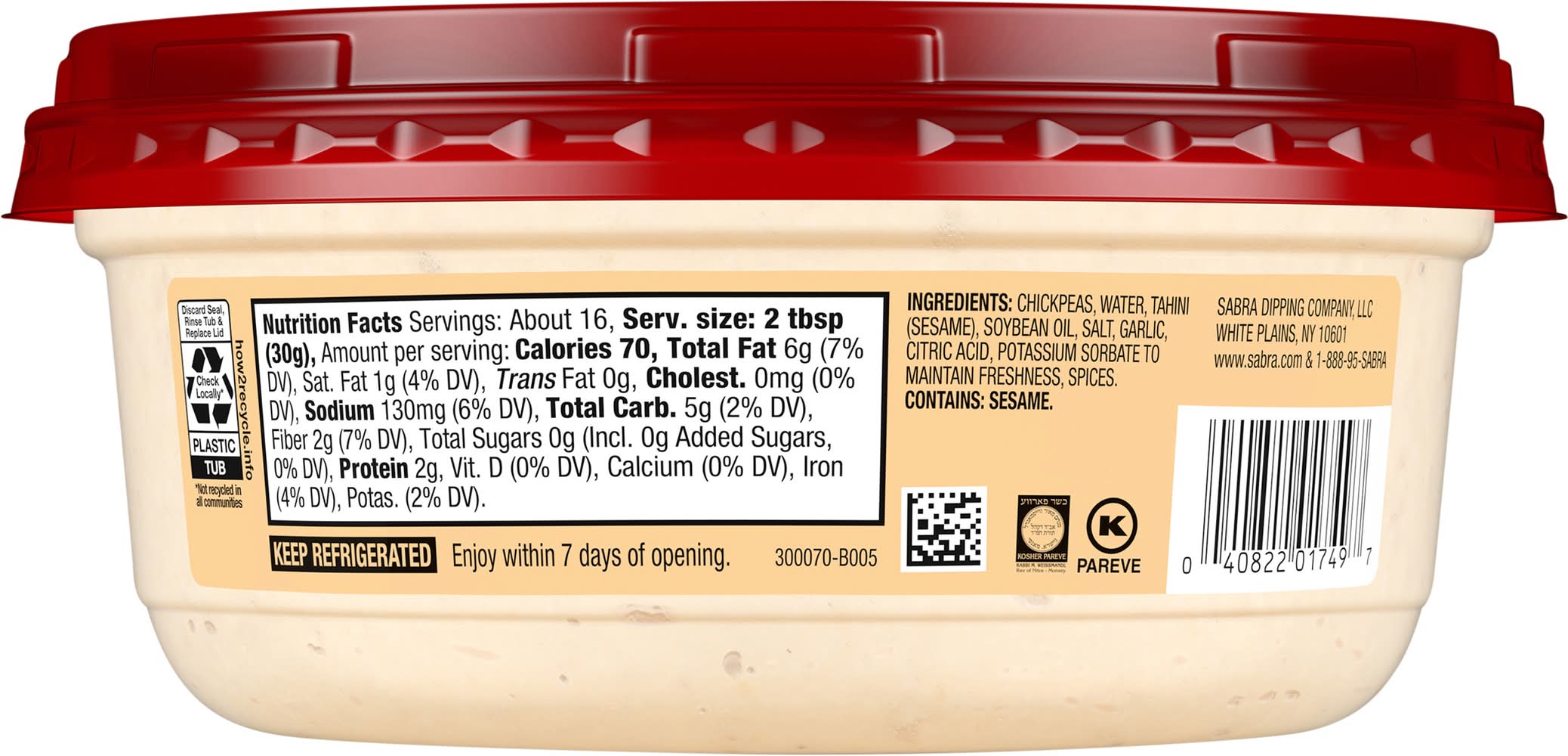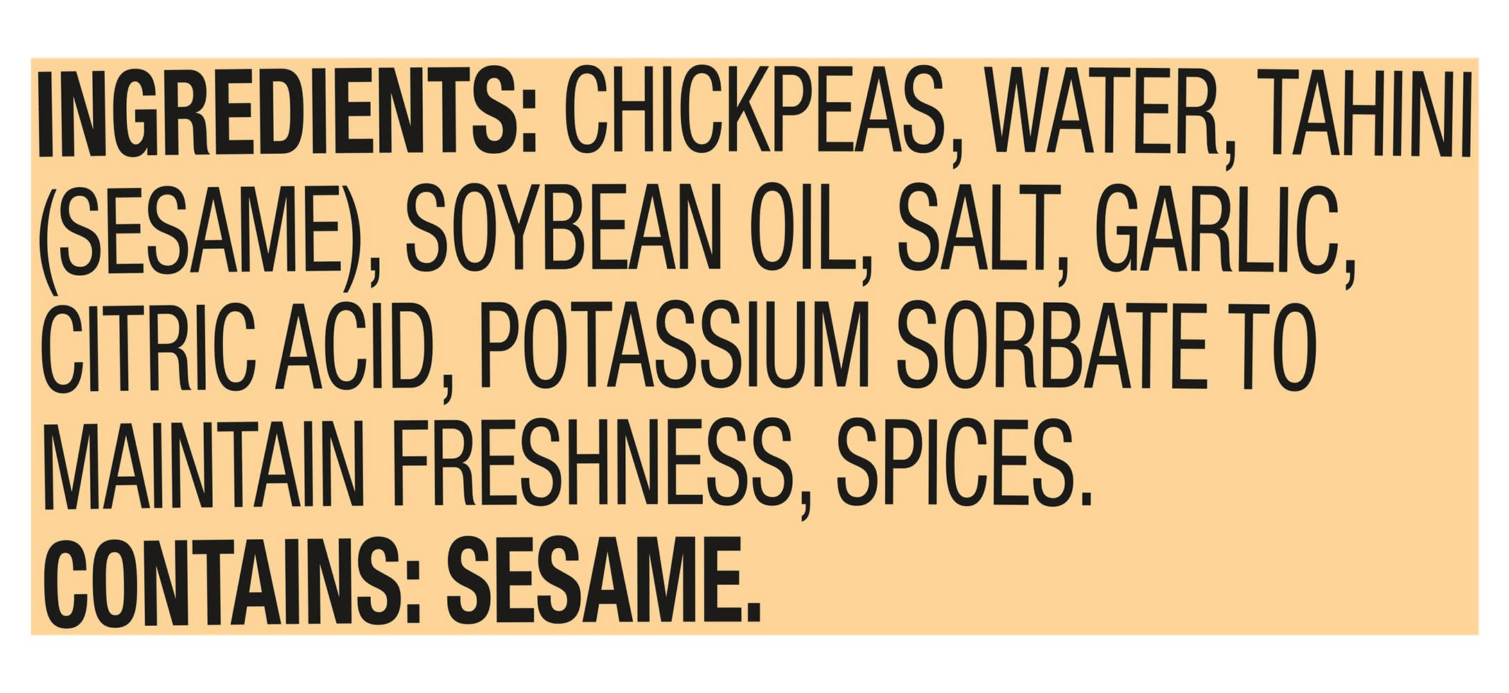 Ingredients: Chickpeas, Water, Tahini (Sesame), Soybean Oil, Salt, Garlic, Citric Acid, Potassium Sorbate to Maintain Freshness, Spices Contains: Sesame, Soybeans