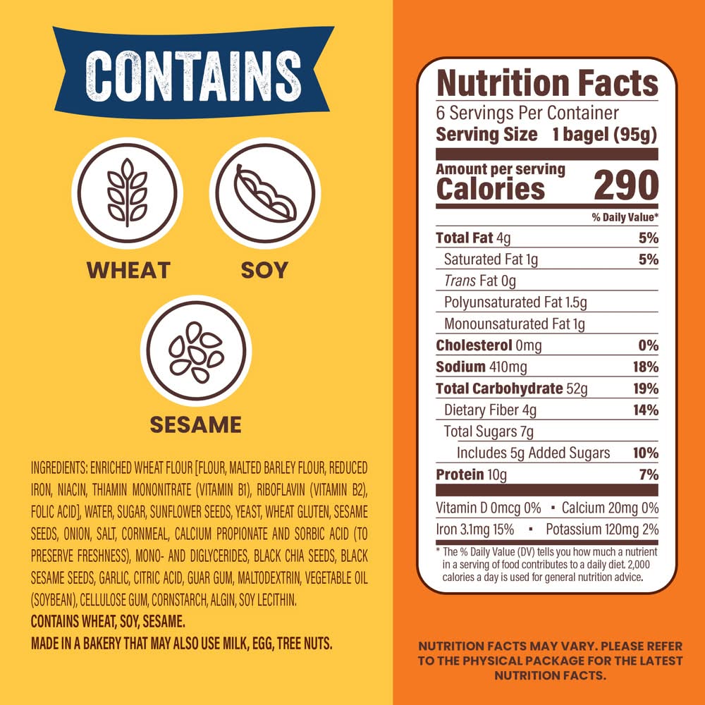 Ingredients: ENRICHED WHEAT FLOUR [WHEAT FLOUR, NIACIN, REDUCED IRON, THIAMIN MONONITRATE (VITAMIN B1), RIBOFLAVIN (VITAMIN B2), FOLIC ACID], WATER, SUGAR, SESAME SEEDS, SUNFLOWER SEEDS, YEAST, WHEAT GLUTEN, ONION, SALT, CORN GRITS, BLACK CHIA SEEDS, BLACK SESAME SEEDS, GARLIC, CALCIUM PROPIONATE AND SORBIC ACID (TO PRESERVE FRESHNESS), MONO- AND DIGLYCERIDES, MALTODEXTRIN, GUAR GUM, CITRIC ACID, SODIUM ALGINATE, SOY LECITHIN. Contains: Wheat, Soybeans, Sesame, Barley, Gluten, Corn, Milk, Eggs, Tree Nuts
