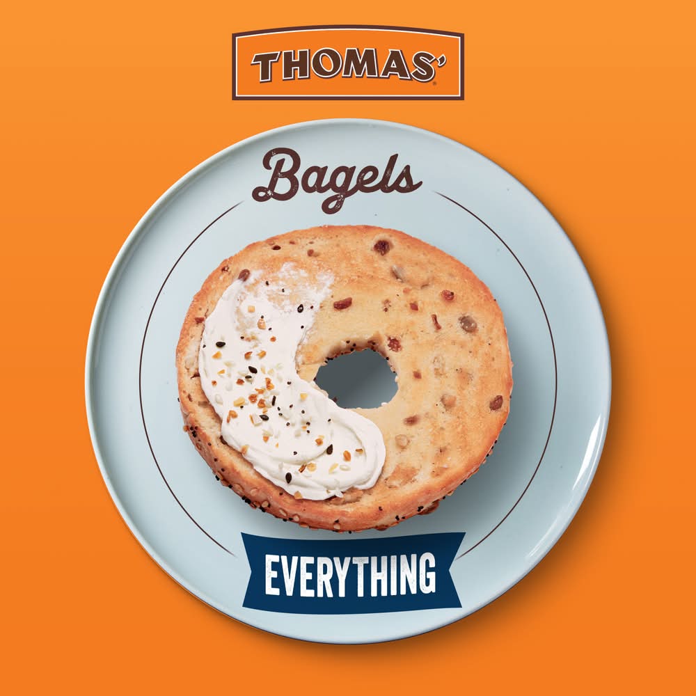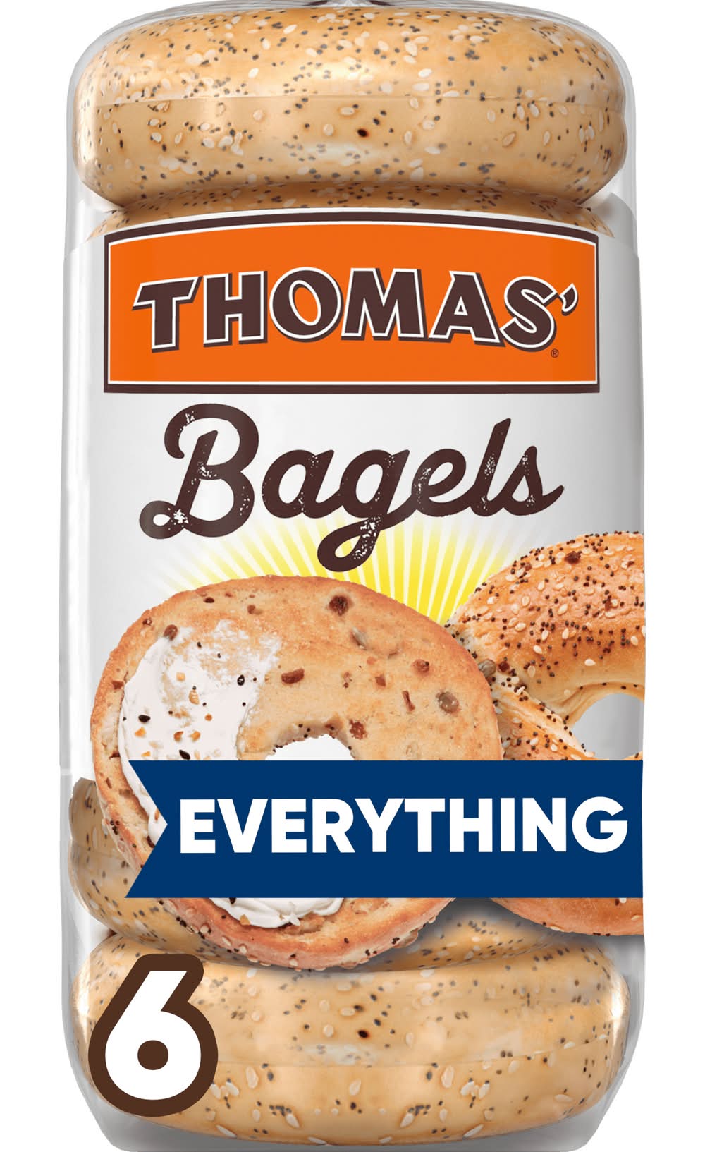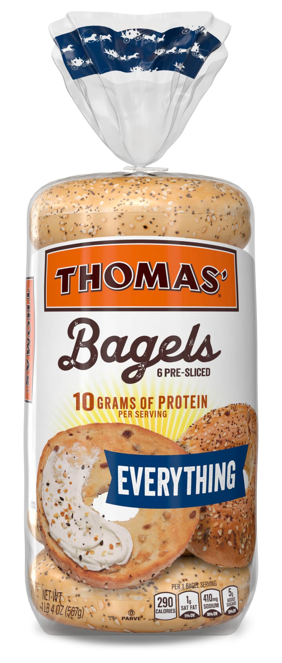 Indulge in the delightful experience of Thomas' Bagels Everything Bagels, 6 count, 20 oz, where every bite elevates your breakfast routine. These pre-sliced bagels boast a soft yet chewy texture, perfect for toasting to golden perfection. With 10 grams of protein per serving, they are not only a delicious choice but also a wholesome way to kickstart your day. Imagine spreading creamy butter or rich cream cheese over the freshly toasted surface, or crafting a classic lox bagel for a charming brunch gathering. The bold blend of spices and toppings brings the essence of a bagel shop right to your kitchen, making these the best bagels for savoring moments together. Circle U Orthodox Union - Parve certified, they invite you to relish the tradition of bagel enjoyment, whether as a sandwich or a standalone treat. Bimbo Bakeries USA, Inc., Horsham,PA,19044