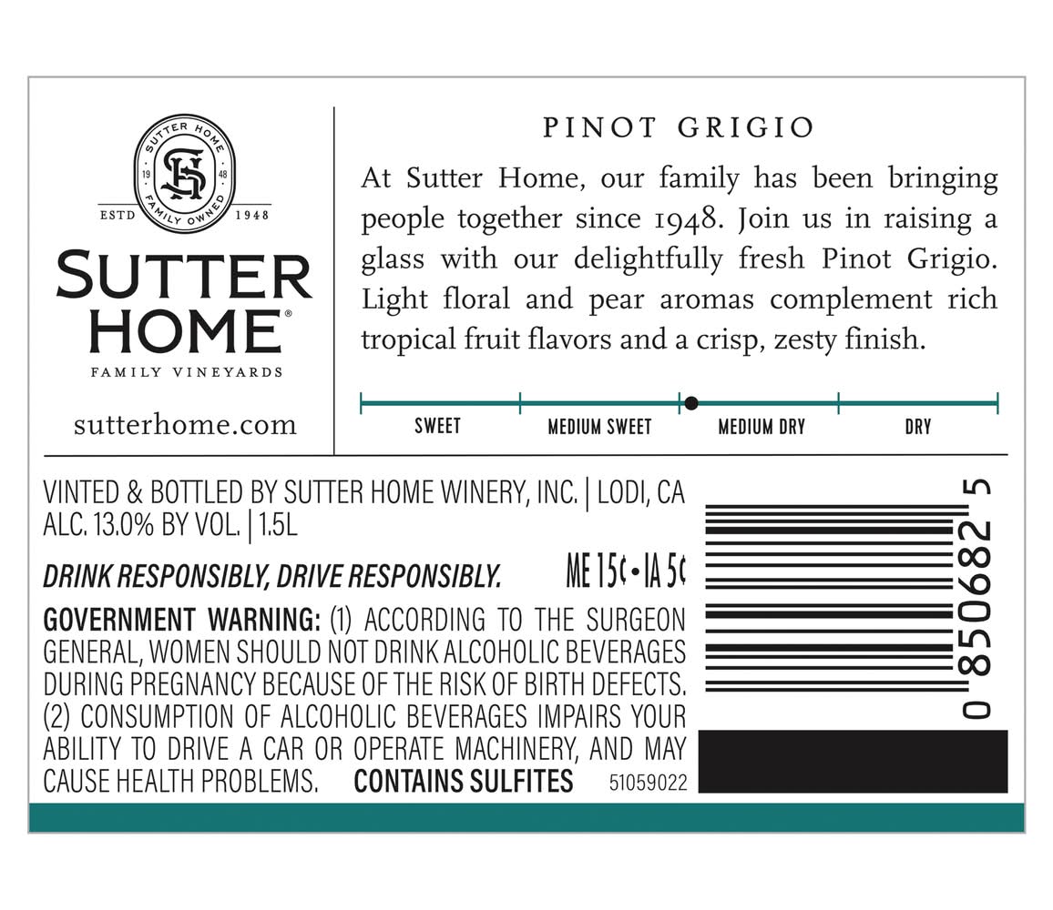 Sutter Home Pinot Grigio White Wine is always a crowd pleaser. Light, crisp and refreshing, this Pinot Grigio wine offers vibrant tropical fruit flavors and vivid acidity with a clean finish. Delicate floral notes mingle with ripe pear, peach and melon on the nose, leading to bright citrus, white peach and tropical fruit flavors. Sutter Home Wine has earned Silver from 2023 Toast of the Coast Wine Competition and 90 points - Gold from 2020 San Diego International. Serve this fruit-forward dry white wine for a variety of occasions. It pairs well with pasta primavera, citrusy salads and grilled seafood. This wine features grapes sourced from California vineyards. To enhance its fresh fruit flavors and delicate aromas, the wine is cold-fermented and aged entirely in stainless steel tanks. As you gather around the table this holiday season, enjoy Sutter Home wine in your favorite wine glasses with mashed potatoes, chicken, turkey, stuffing and all the pumpkin & apple pies. Or get cozy around the fireplace and warm up while enjoying a glass of wine. Sutter Home wines is the perfect holiday gift. Whether you gift wine as a stocking stuffer, to your neighbor across the street, or serve at your own holiday table. Sutter Home wines are a great addition to holiday wine gift sets! Sutter Home, family owned since 1948, is the brand generations of wine lovers trust to deliver consistent, award-winning quality and value for every wine occasion. • Brand: Sutter home • Alcohol by volume: 13% • Sutter Home Winery Inc., St. Helena, CA