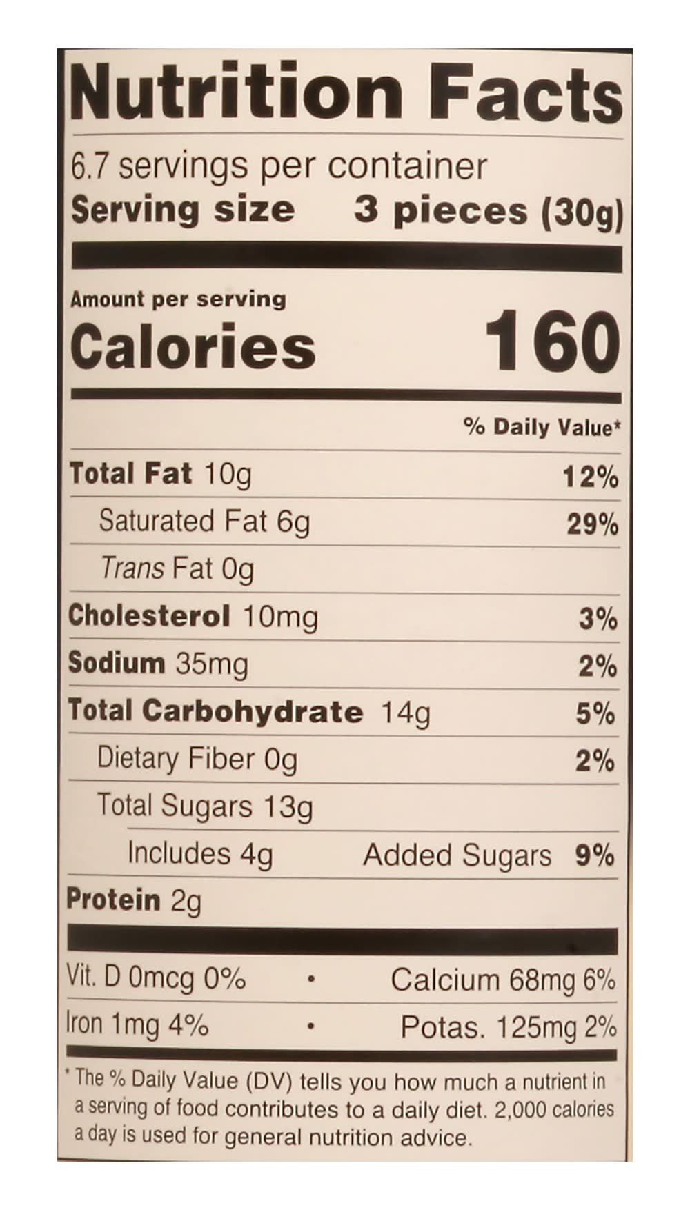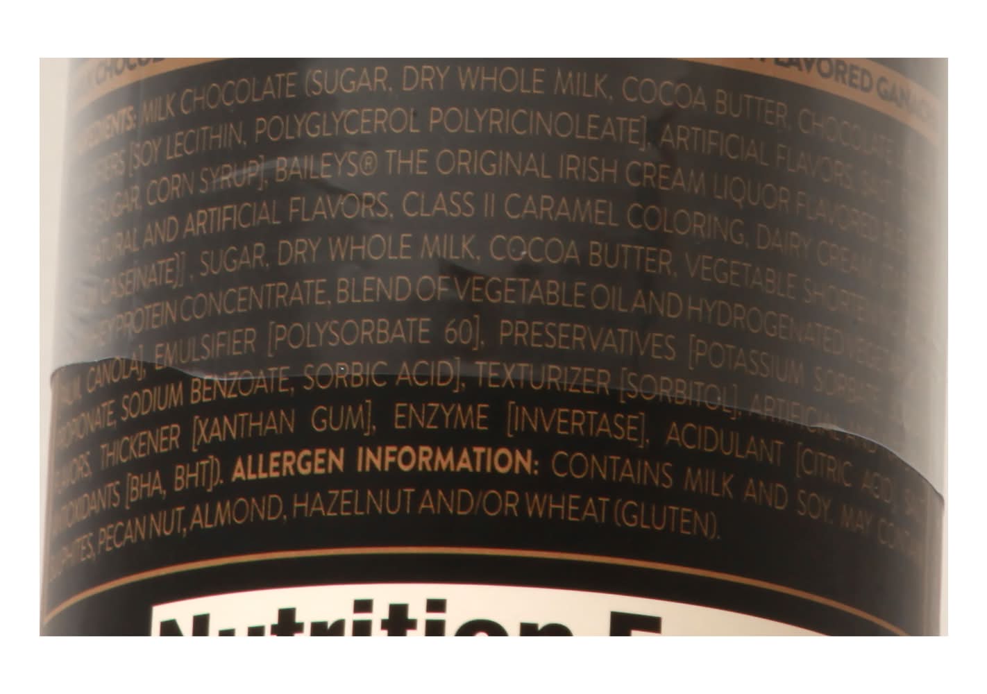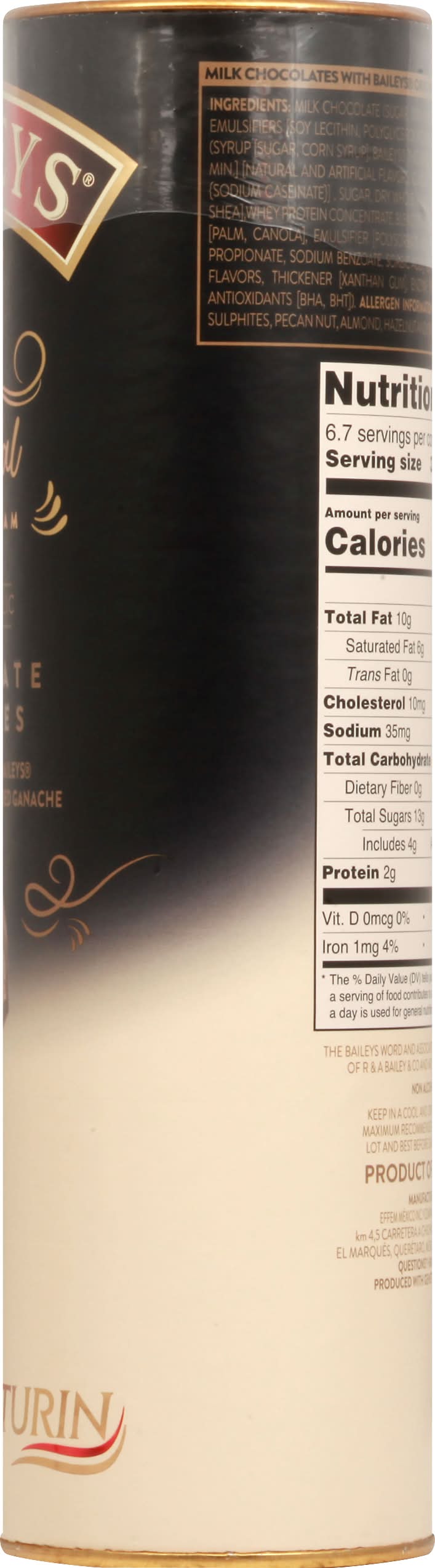 Ingredients: Milk Chocolate (Sugar, Dry Whole Milk, Cocoa Butter, Chocolate Liquor Emulsifiers [Soy Lecithin, Polyglycerol Polyricinoleate], Artificial Flavors, Salt), Filling (Syrup [Sugar, Corn Syrup] Baileys the Original Irish Cream, Liquor Flavored Blend [5% Min.] [Natural and Artificial Flavors, Class II Caramel Coloring, Dairy Cream, Stabilizer {Sodium Caseinate}], Sugar, Dry Whole Milk, Cocoa Butter, Vegetable Shortening [Palm, Shea], Whey Protein Concentrate, Blend of Vegetable Oil and Hydrogenated Vegetable Fat [Palm, Canola], Emulsifier [Polysorbate 60] Preservatives [Potassium Sorbate, Sodium Propionate, Sodium Benzoate, Sorbic Acid], Texturizer [Sorbitol], Artificial and Natural Flavors, Thickener [Xanthan Gum], Enzyme [Invertase], Acidulant [Citric Acid], Salt, Antioxidants [BHA, BHT]) Contains: Soybeans, Milk, Tree Nuts, Wheat, Gluten
