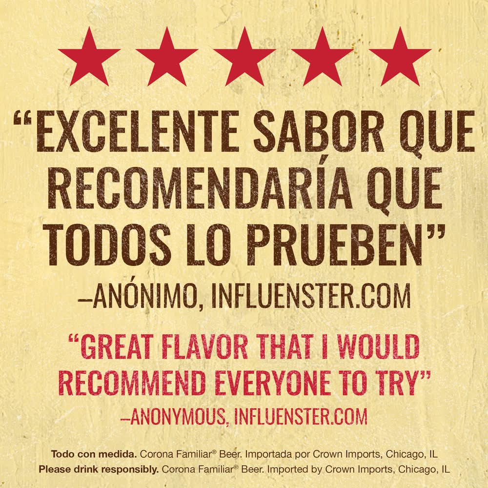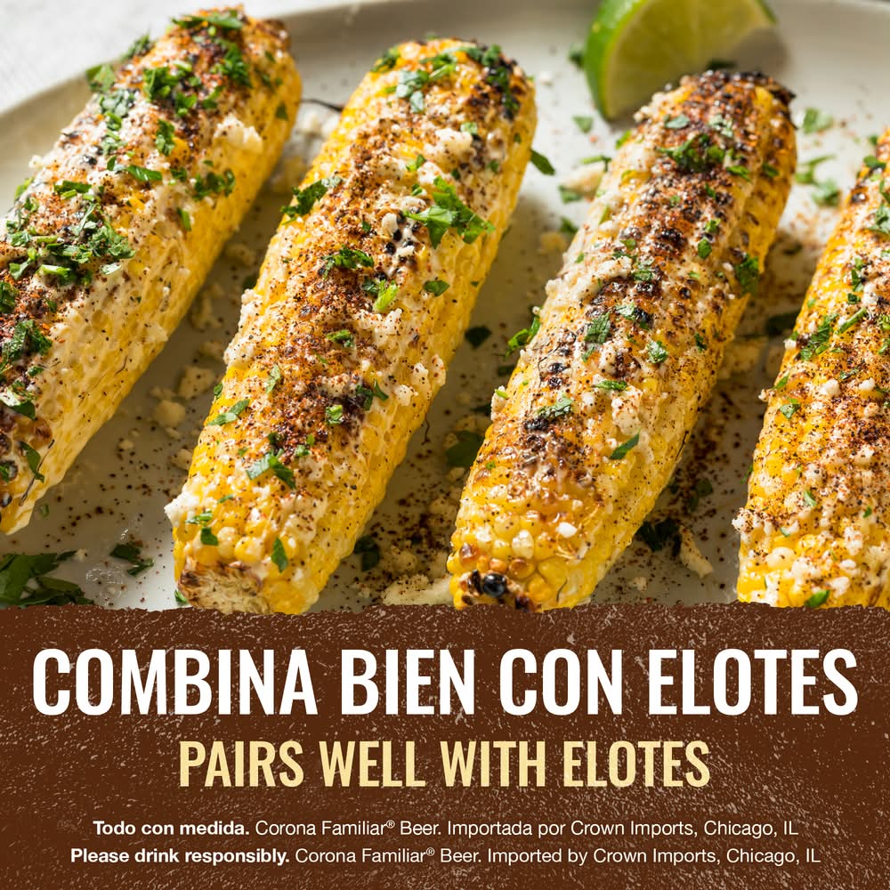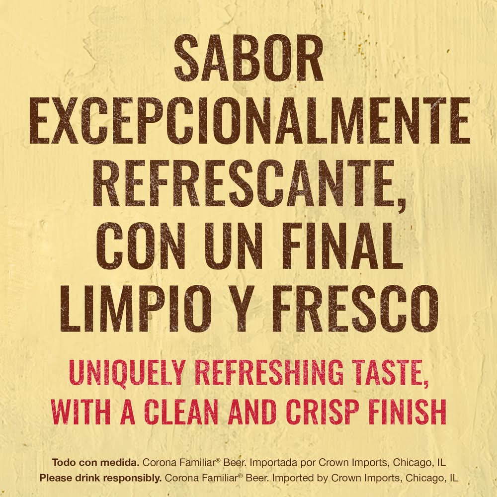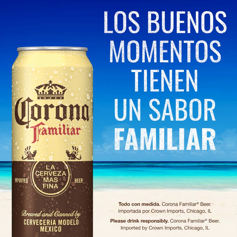 A traditional cerveza, Corona Familiar Lager Beer is a full-flavored Mexican beer with bright, crisp taste. This Corona beer is perfect for bringing to gatherings with loved ones. • Alcohol by volume: 4.8% • Crown Imports, Chicago, IL • Packaging: Reusable