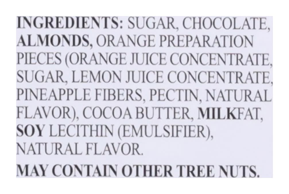 Ingredients: Sugar, Chocolate, Almonds, Orange Preparation Pieces (Orange Juice Concentrate, Sugar, Lemon Juice Concentrate, Pineapple Fibers, Pectin, Natural Flavor), Cocoa Butter, Milkfat, Soy Lecithin (Emulsifier), Natural Flavor Contains: Tree Nuts, Almonds, Milk, Soybeans, Tree Nuts