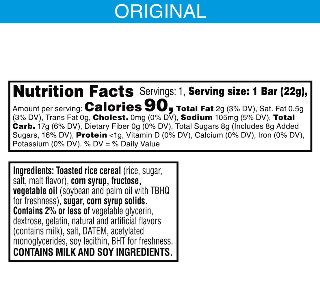Enjoy the fun of everyday moments with the irresistible taste of Rice Krispies Treats Crispy Marshmallow Snack Bars Original. Create memorable moments with each and every delectable square that pulls apart to reveal ooey, gooey goodness. Made with crispy rice cereal and the taste of soft marshmallows, each bar is a delicious, ready-to-eat treat wherever you go. A classically delicious snack, these individually wrapped marshmallow bars are perfect for enjoying together as a family; Enjoy at home or take a few with you for traveling, lunchtime, at the game, and more. It's easy to share with friends and family. Make someone's day by adding Rice Krispies Treats Crispy Marshmallow Snack Bars to goodie bags, gift baskets, and care packages. Satisfy your sweet craving with the goodness and on-the-go convenience of Rice Krispies Treats Marshmallow Snack Bars Original. • Number of servings: 1 • Kellogg Sales, Battle Creek, MI, 49016, Ph: 800-962-1413