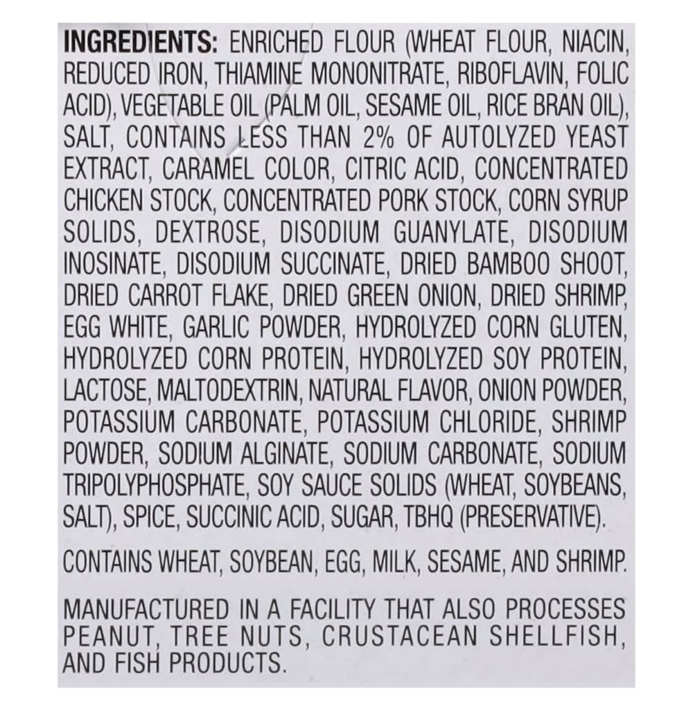 Ingredients: Enriched Flour (Wheat Flour, Niacin, Reduced Iron, Thiamine Mononitrate, Riboflavin, Folic Acid), Vegetable Oil (Palm Oil, Sesame Oil, Rice Bran Oil), Salt, Contains Less than 2% of Autolyzed Yeast Extract, Caramel Color, Citric Acid, Concentrated Chicken Stock, Concentrated Pork Stock, Corn Syrup Solids, Dextrose, Disodium Guanylate, Disodium Inosinate, Disodium Succinate, Dried Bamboo Shoot, Dried Carrot Flake, Dried Green Onion, Dried Shrimp, Egg White, Garlic Powder, Hydrolyzed Corn Gluten, Hydrolyzed Corn Protein, Hydrolyzed Soy Protein, Lactose, Maltodextrin, Natural Flavor, Onion Powder, Potassium Carbonate, Potassium Chloride, Shrimp Powder, Sodium Alginate, Sodium Carbonate, Sodium Tripolyphosphate, Soy Sauce Solids (Wheat, Soybeans, Salt), Spice, Succinic Acid, Sugar, TBHQ (Preservative) Contains: Wheat, Soybeans, Eggs, Milk, Crustacean Shellfish, Sesame, Corn, Peanuts, Tree Nuts, Fish