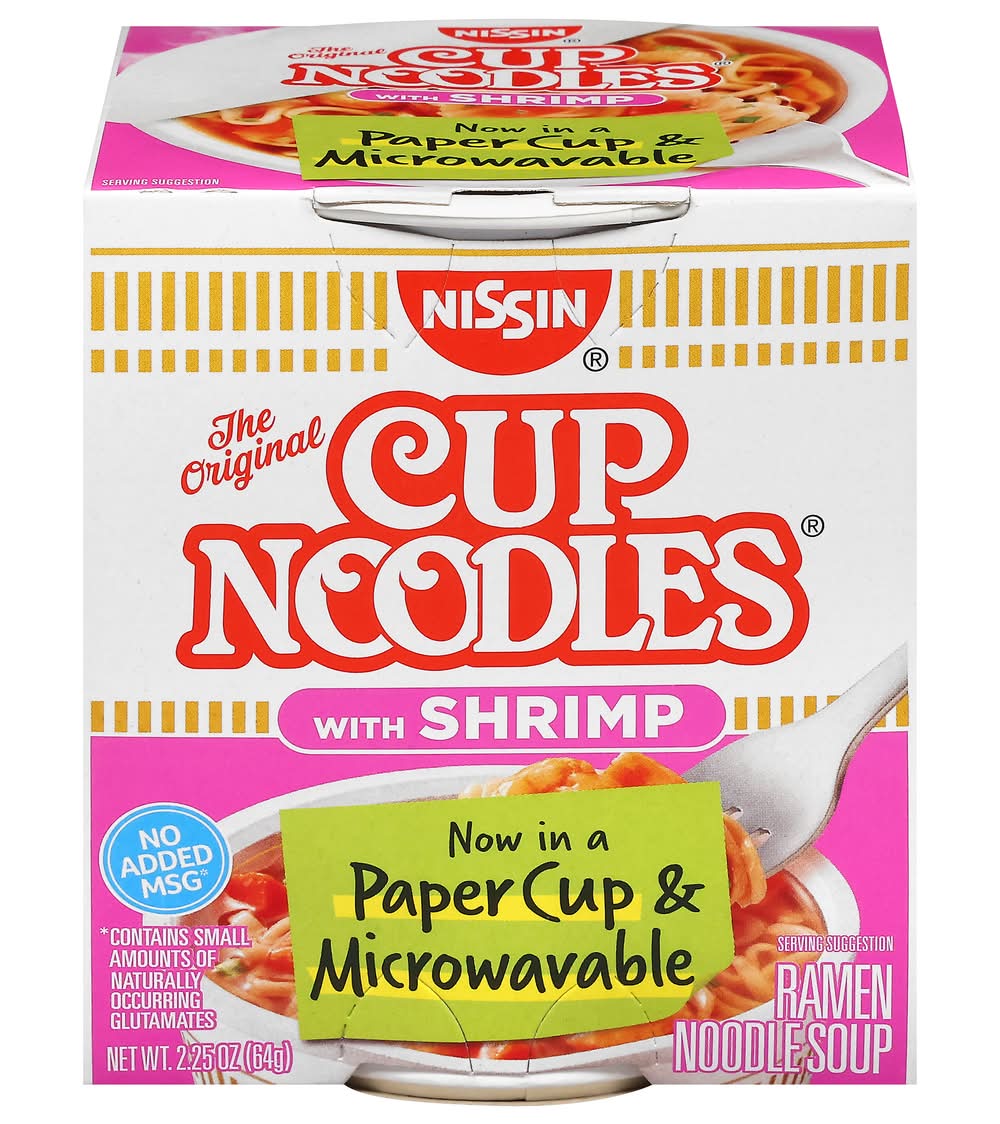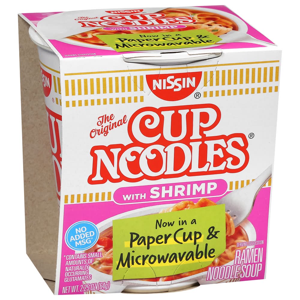 The original Cup Noodles with shrimp. Contains bioengineered food ingredients. No added MSG (Contains small amounts of naturally occurring glutamates). Now in a paper cup & microwavable. Much more than a soup. For the very best in Ramen Noodle Soup. For the tastiest results, please see lid for recommended cooking directions. Nissin Foods (USA) Co., Inc., 2001 W. Rosecrans Ave. Gardena
