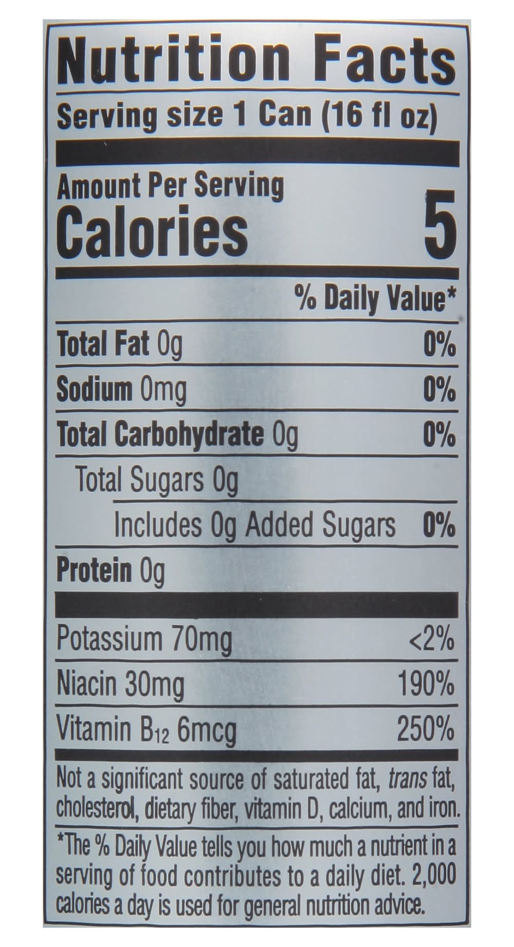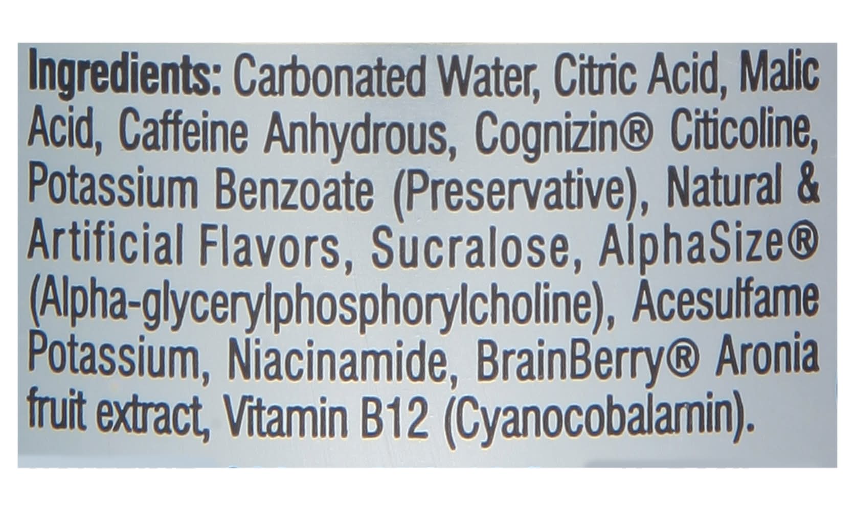 Ingredients: Carbonated Water, Citric Acid, Malic Acid, Caffeine Anhydrous, Cognizin Citicoline, Potassium Benzoate (Preservative), Natural & Artificial Flavors, Sucralose, Alphasize (Alpha-Glycerylphosphorylcholine), Acesulfame Potassium, Niacinamide, Brainberry Aronia Fruit Extract, Vitamin B12 (Cyanocobalamin)