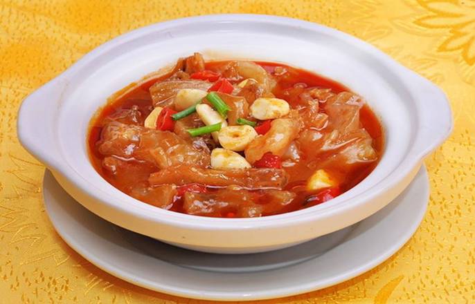 Beef tendons boiled to tender perfection, typically served in a spicy broth that may include a variety of Chinese spices and seasonings for a bold flavor.