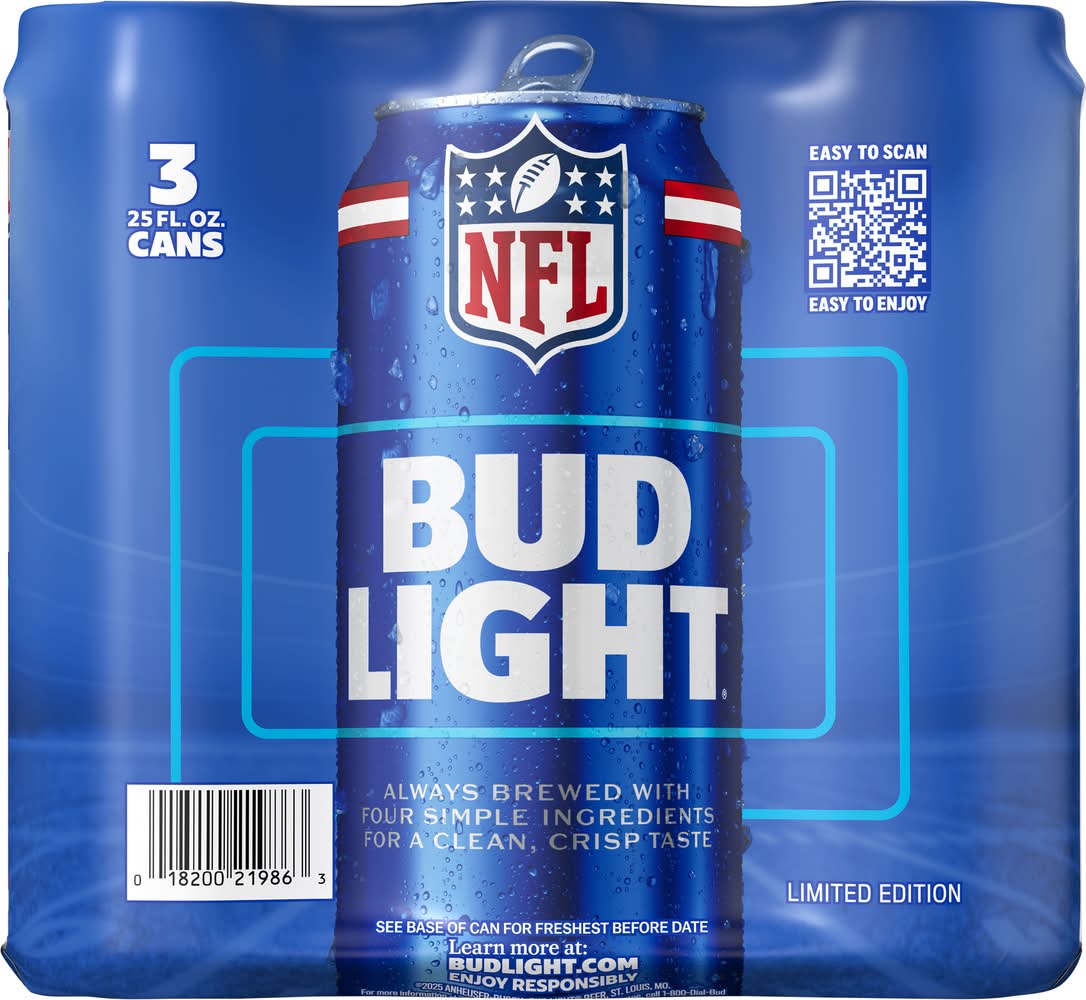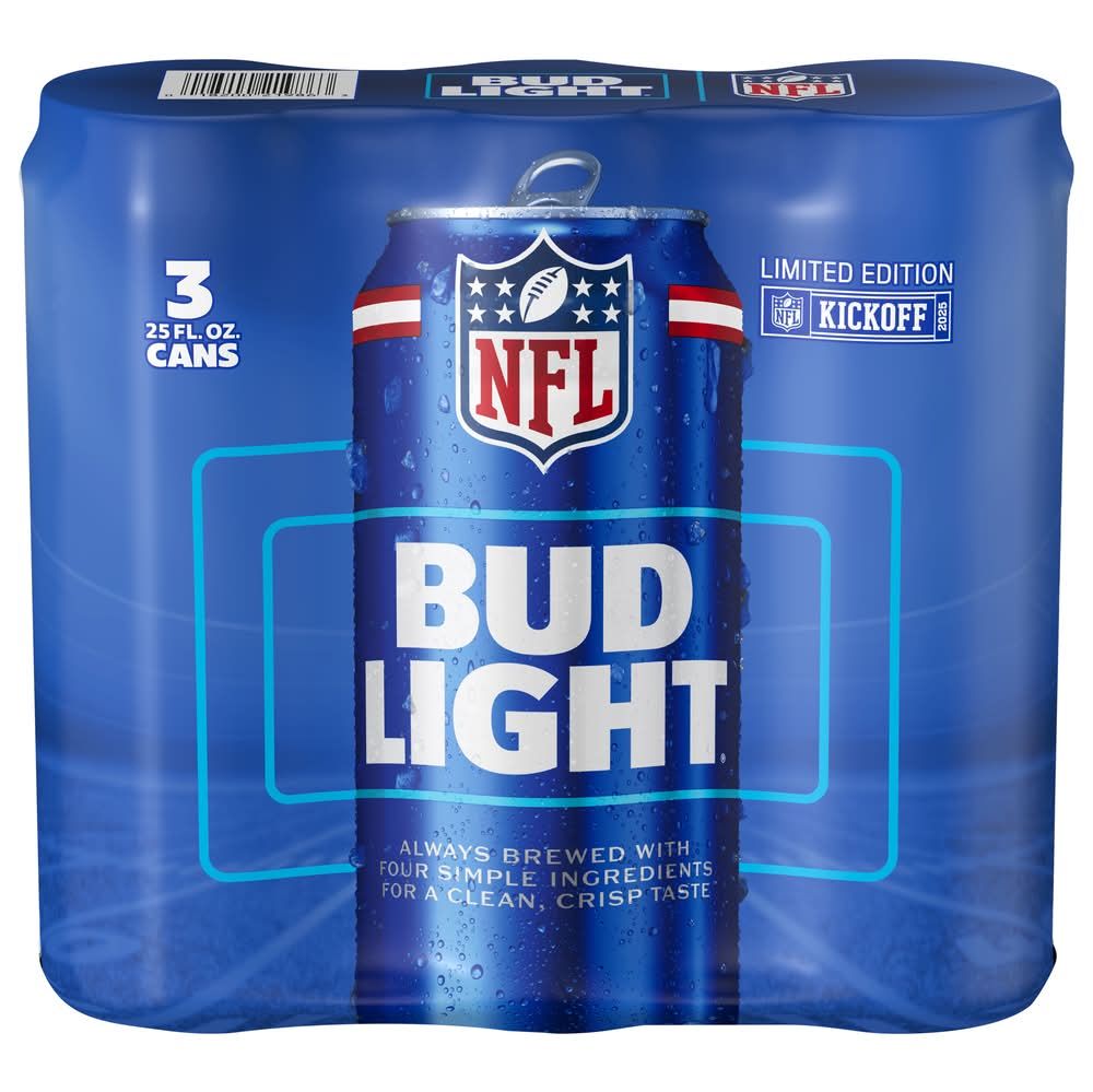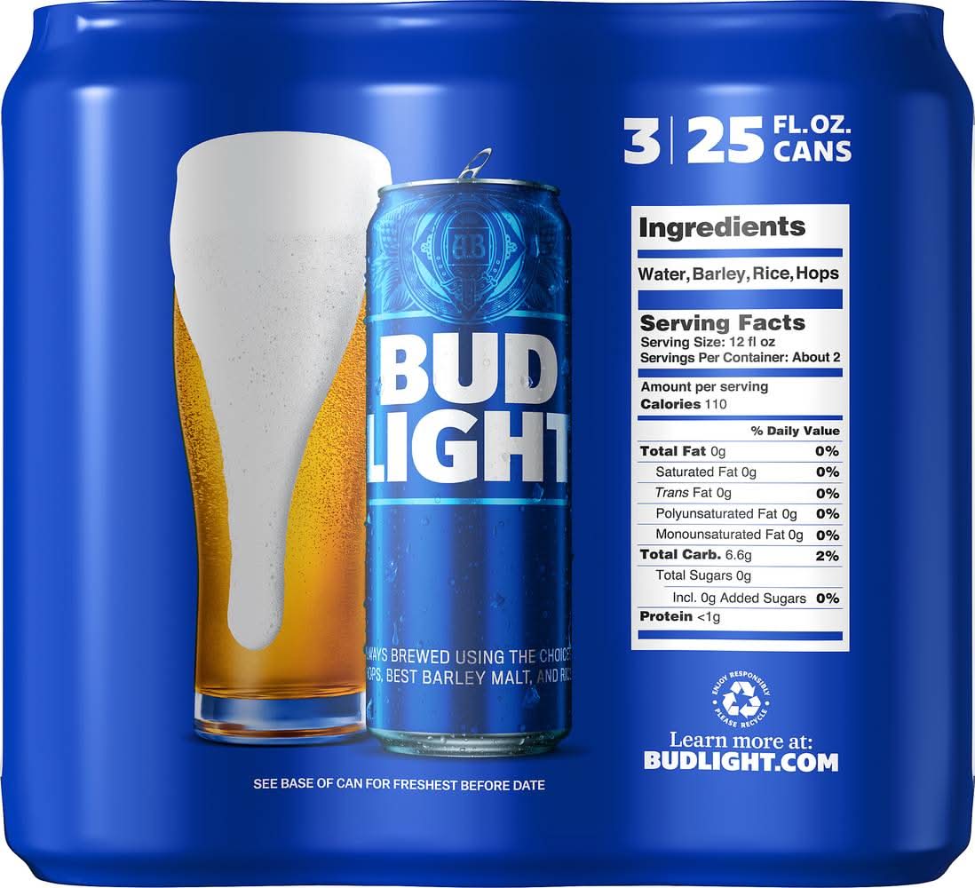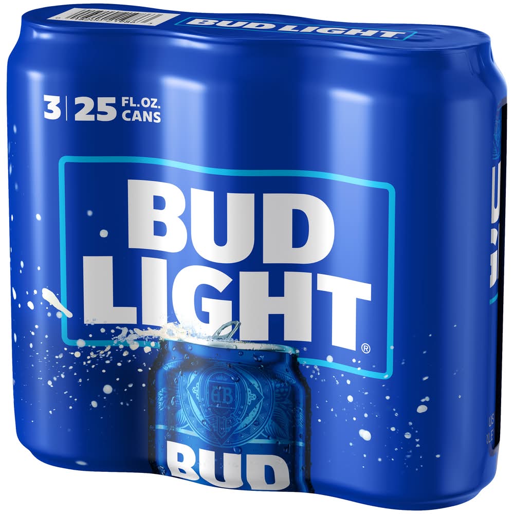 Bud light is the light, crisp american lager everyone knows and loves crafted for easy drinking and unmatched refreshment. Brewed with a blend of barley malts, rice, and premium aroma hops, it delivers a clean, crisp taste with delicate malt sweetness and a smooth, crisp finish. With no preservatives or artificial flavors, and just 4.2% abv, bud light is perfect for bbqs, beach days, boat rides, and summer hangouts. It pairs perfectly with grilled burgers, hot dogs, wings, or whatever’s sizzling on the grill. Whether you're kicking back at a bonfire or turning up your favorite country playlist, grab a pack of bud light today and keep the good times flowing all season long. • Pack size: 3 • Alcohol by volume: 4.2% • Number of servings: 2 • Packaging: Reusable