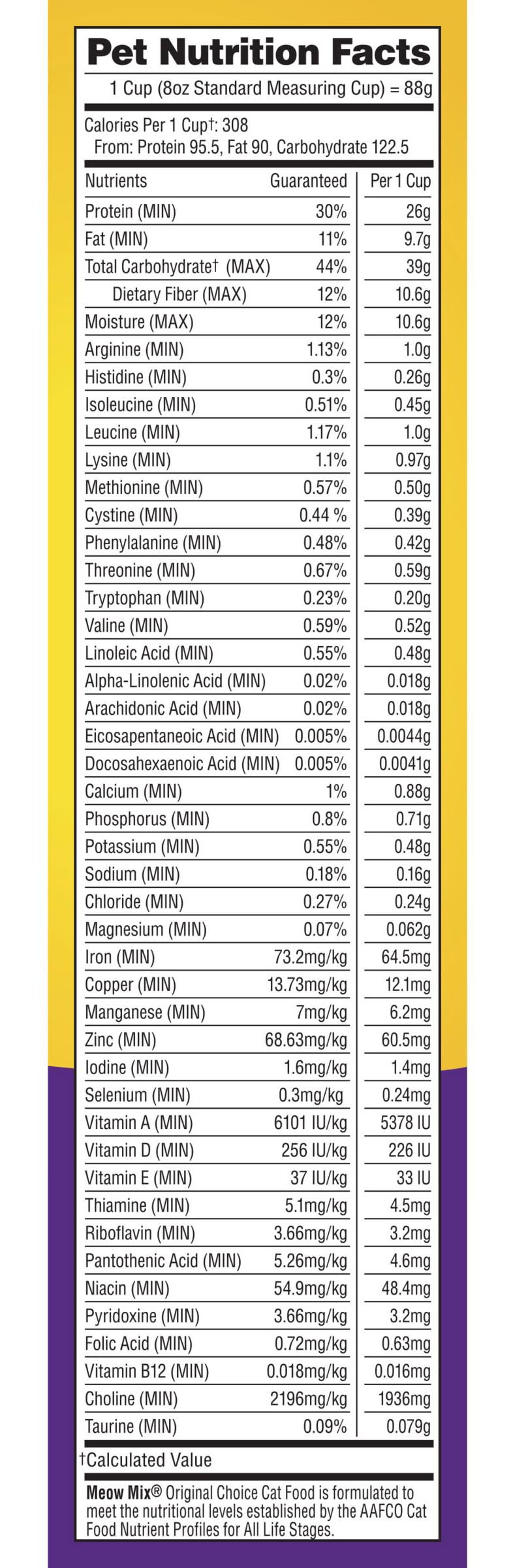Calorie Content (Calculated): Metabolizable Energy (ME): 3470 kcal/kg; 310 kcal/8 oz cup. Nutritional Statement: Meow Mix Original Choice cat food is formulated to meet the nutritional levels established by the AAFCO Cat Food Nutrient Profiles for All Life Stages. Packaging: Reusable