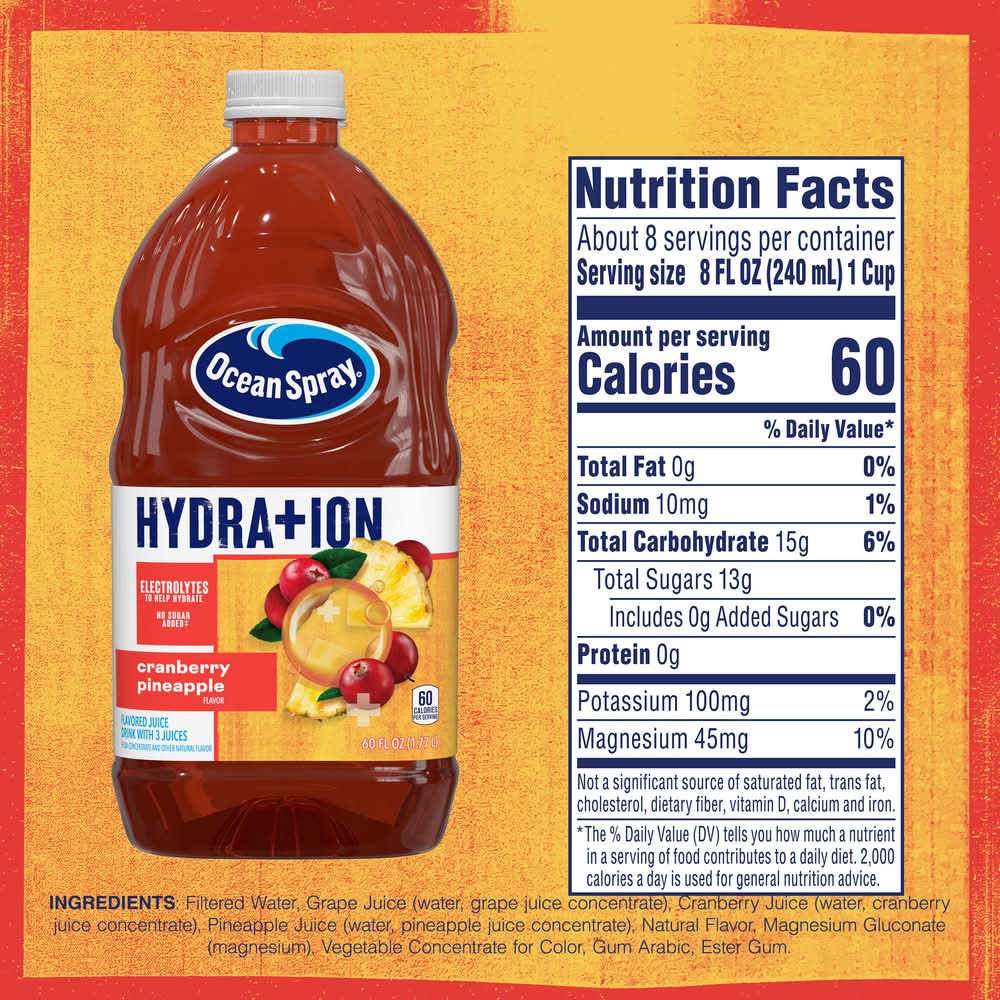Ocean Spray Revi Plus Alize Juice Drink offers a blend of three fruit juices from concentrate, enhanced with other natural flavors for a refreshing taste. Each serving contains 60 calories and is infused with electrolytes, including magnesium, to aid in hydration. The product is pasteurized for safety and does not contain artificial sweeteners or added sugars, although it is not classified as a low-calorie food. The drink is designed to provide a bold, tart flavor profile and a revitalizing experience. • Flavor: Cranberry pineapple • Packaging: Reusable