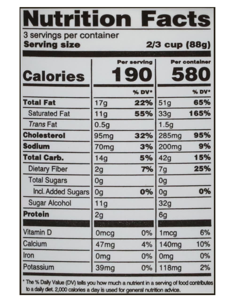Ingredients: Cream, Water, Erythritol, Vegetable Glycerin, Egg Yolks, Chicory Root Fiber, Milk Protein Isolate, Natural Vanilla Flavor, Lactase Enzyme, Peruvian Carob Gum, Guar Gum, Salt, Monk Fruit Contains: Milk, Eggs