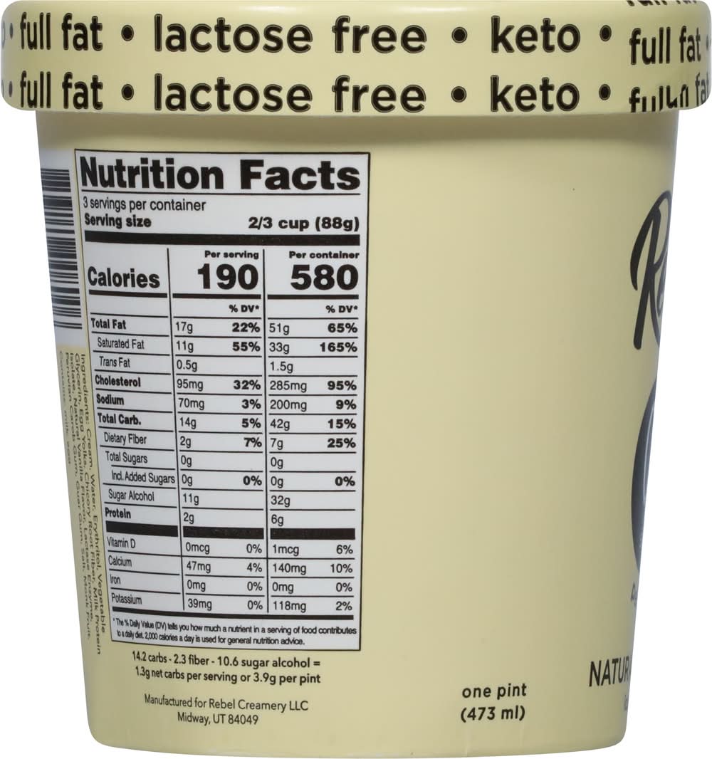 Lactose free. Keto. Full fat. We take things people love and make them without things they hate, like sugar and sketchy alternatives. Full fat, full flavor, low sugar, low net carbs. Let's fight for a better way. Rebels make it right. • Flavor: Vanilla • Rebel Creamery LLC, Midway,UT,84049