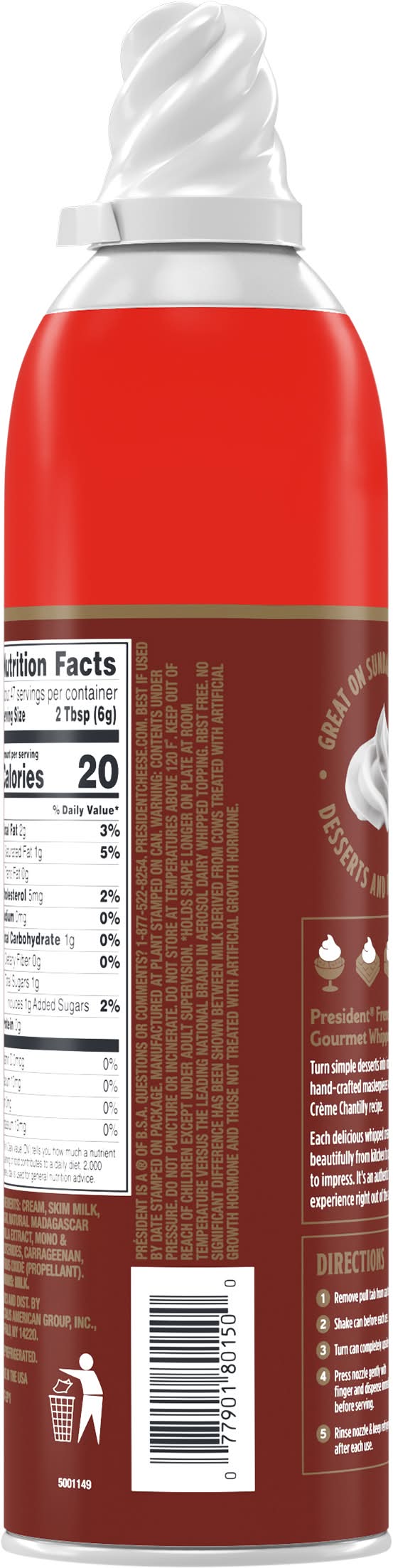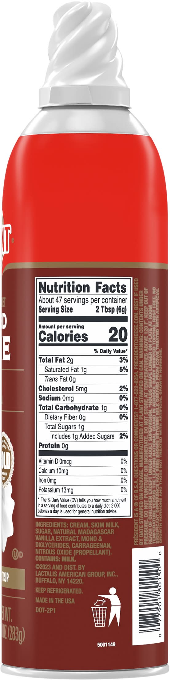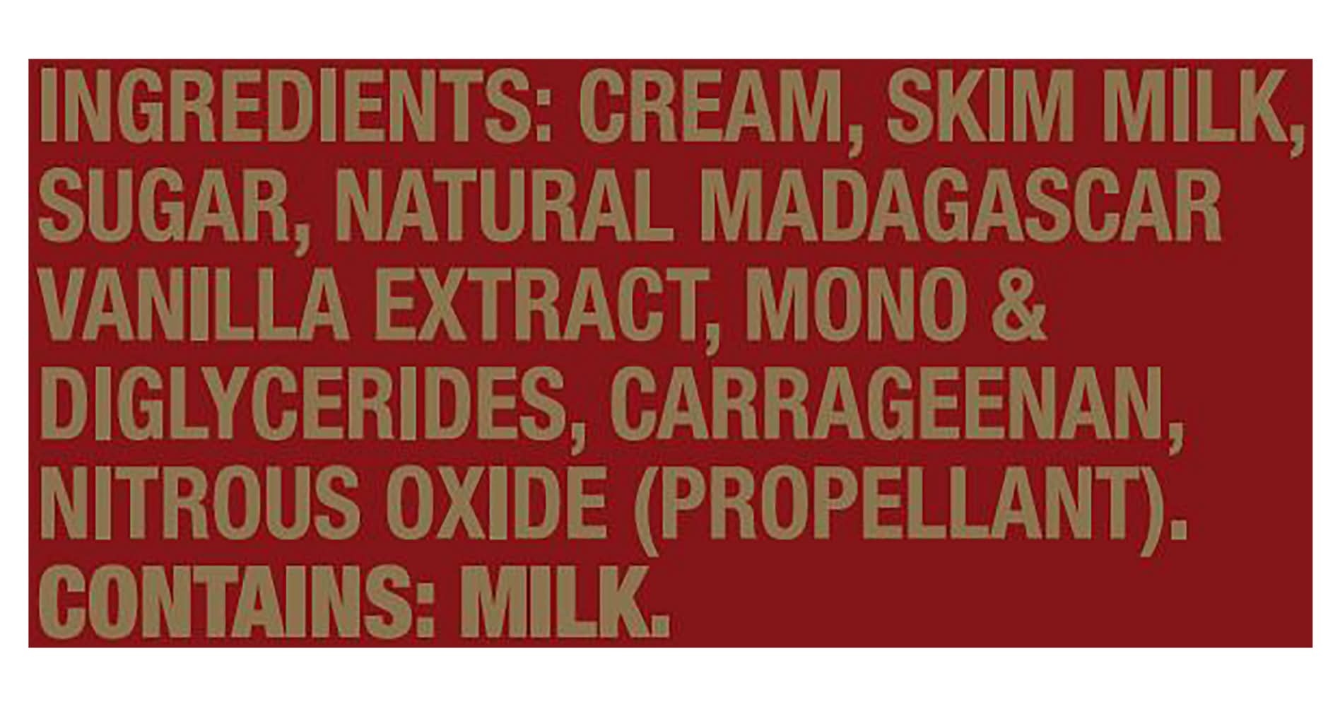 Ingredients: Cream, Skim Milk, Sugar, Natural Madagascar Vanilla Extract, Mono & Diglycerides, Carrageenan, Nitrous Oxide (Propellant) Contains: Milk