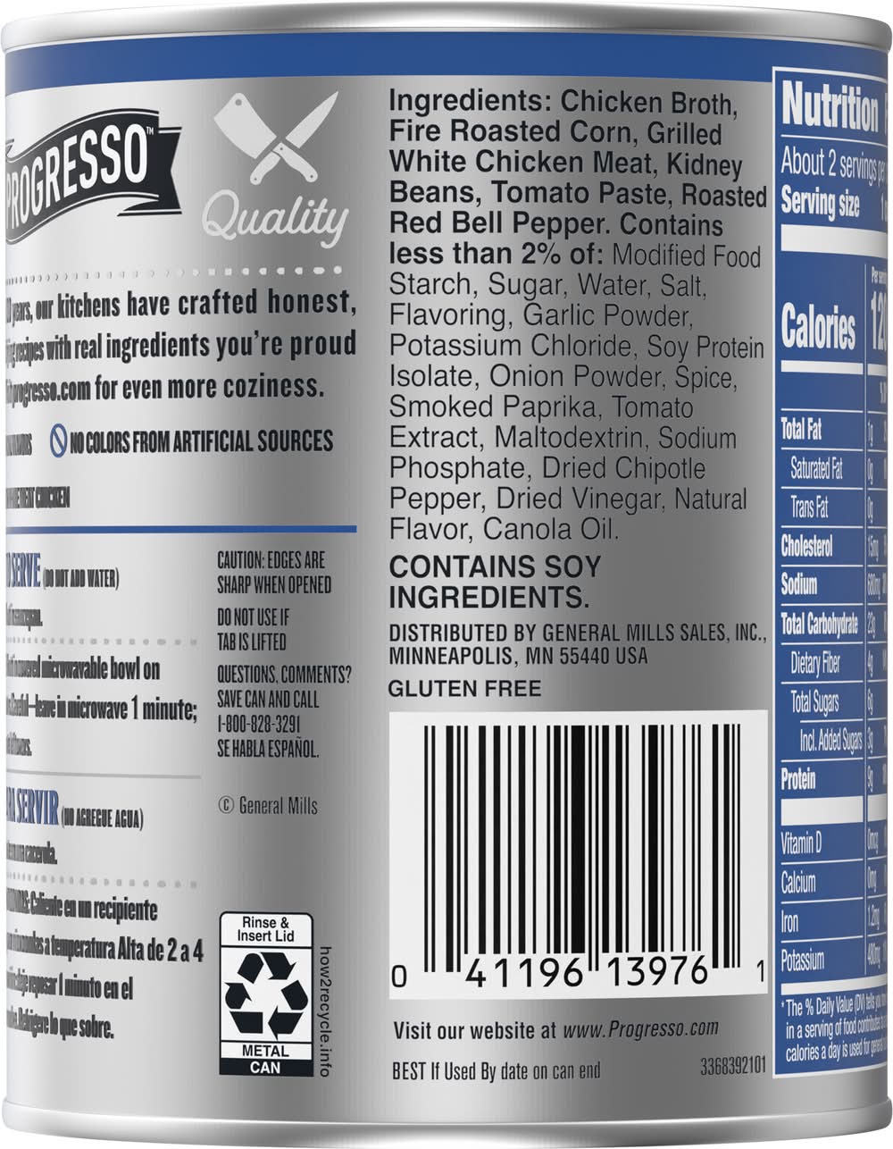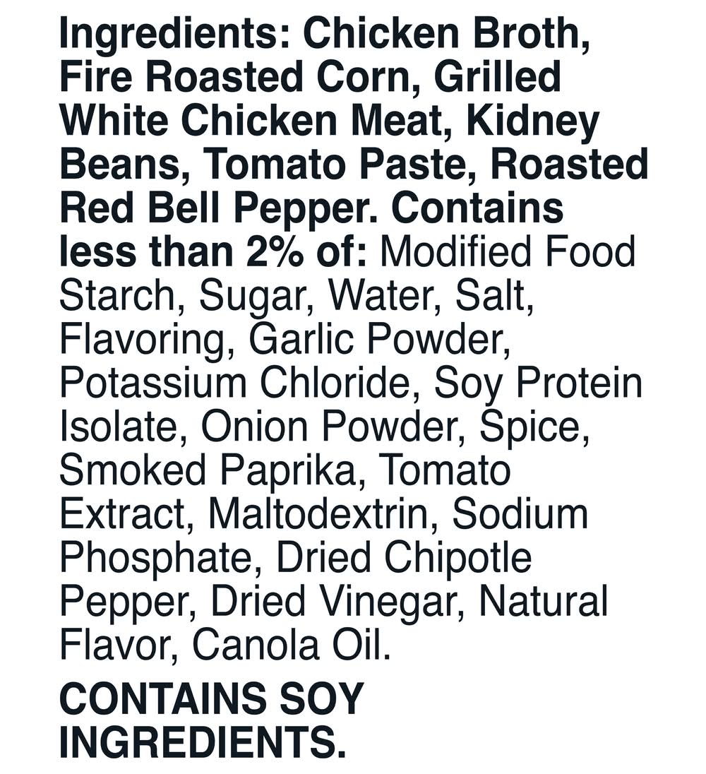 Ingredients: Chicken Broth, Fire Roasted Corn, Grilled White Chicken Meat, Kidney Beans, Tomato Paste, Roasted Red Bell Pepper, Contains Less than 2% of: Modified Food Starch, Sugar, Water, Salt, Flavoring, Garlic Powder, Potassium Chloride, Soy Protein Isolate, Onion Powder, Spice, Smoked Paprika, Tomato Extract, Maltodextrin, Sodium Phosphate, Dried Chipotle Pepper, Dried Vinegar, Natural Flavor, Canola Oil Contains: Soybeans, Corn