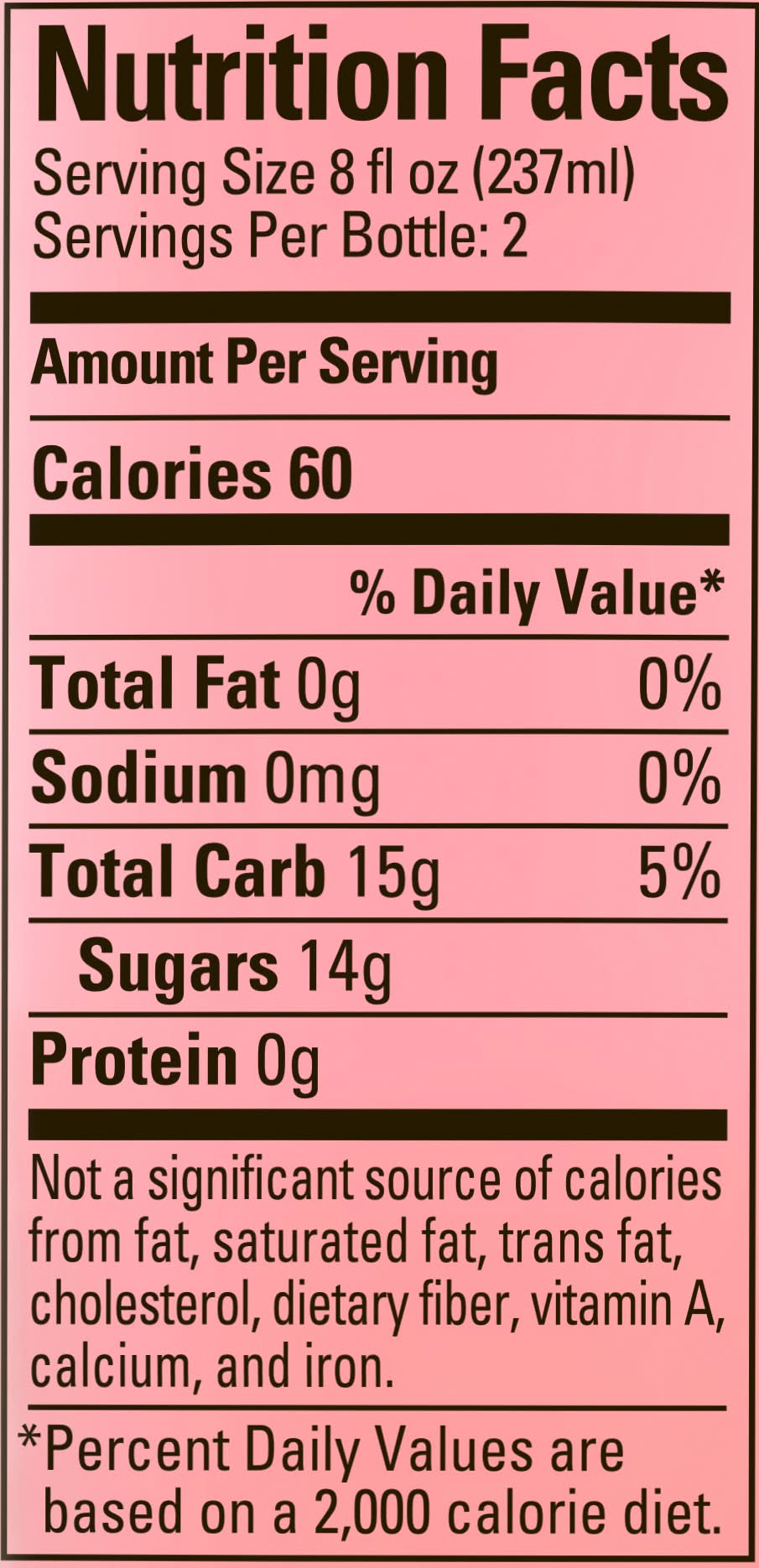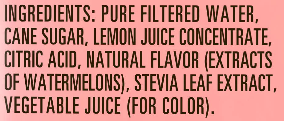 Ingredients: Pure Filtered Water, Lemon Juice From Concentrate, Cane Sugar, Natural Flavors, Citric Acid, Stevia Leaf Extract, Fruit And Vegetable Juice (For Color).