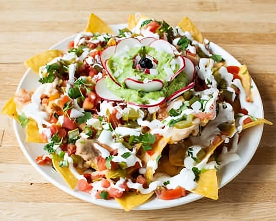 Tortilla chips topped with your meat choice, vegetarian options available, homemade beans, lettuce, cheese mix, jalapenos, Cotija cheese, sour cream and pico de gallo.