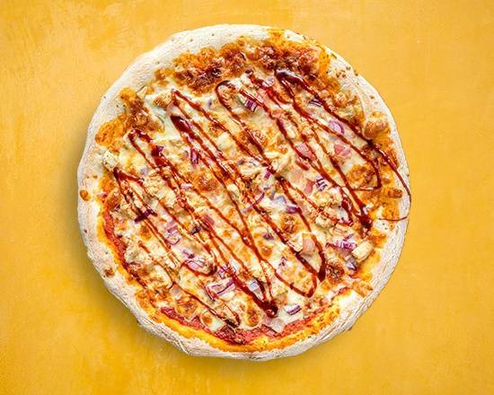 Pizza loaded with BBQ Chicken, onions, mozzarella, and cheddar cheese in a BBQ Sauce over your choice of our house-made signature pizza base.
