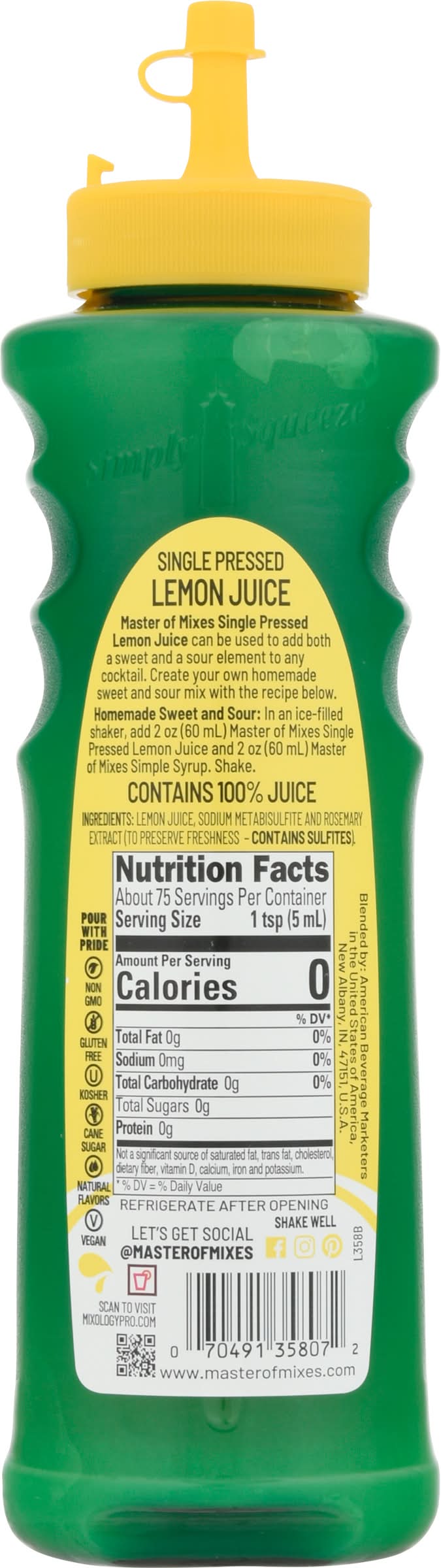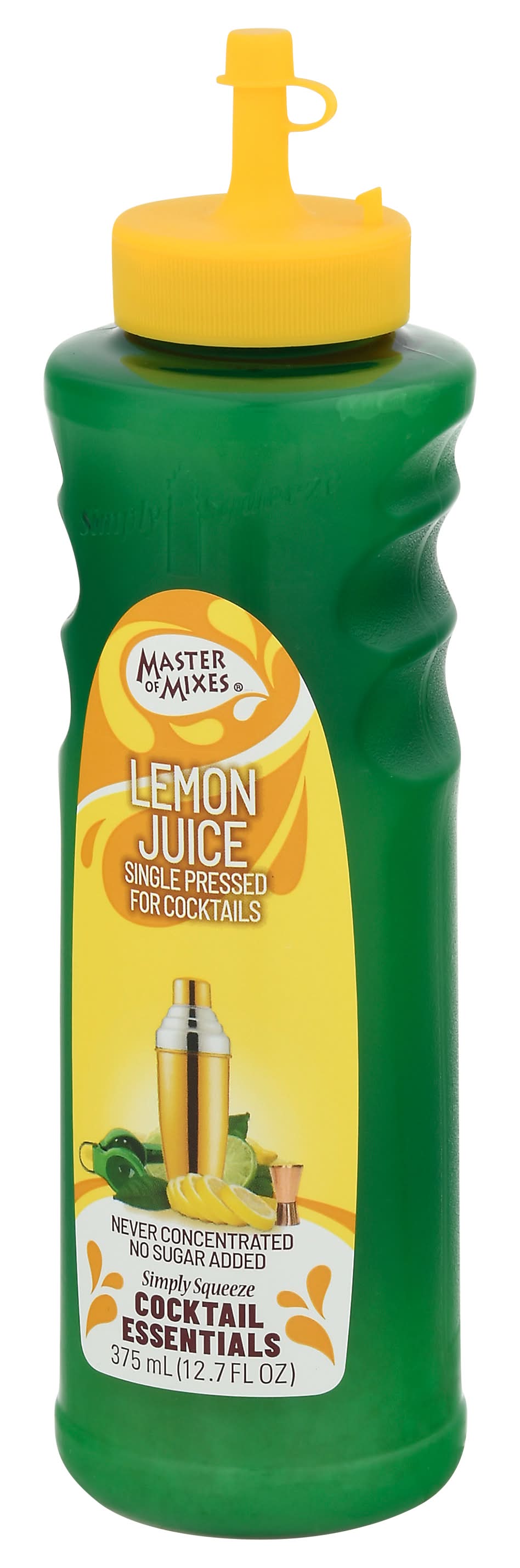 Simply squeeze cocktail essentials. Natural flavors. Gluten free. Vegan. No sugar added. Non-GMO. Single pressed for cocktails. Never concentrated. Single Pressed Lemon Juice can be used to add both a sweet and a sour element to any cocktail. Pour with pride. • Brand: Master of mixes • gluten-free, kosher, vegan, GMO-free