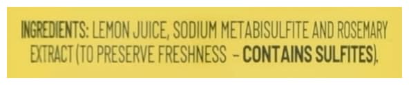 Ingredients: Lemon Juice, Sodium Metabisulfite and Rosemary Extract (to Preserve Freshness - Contains Sulfites) Contains: Sulfites