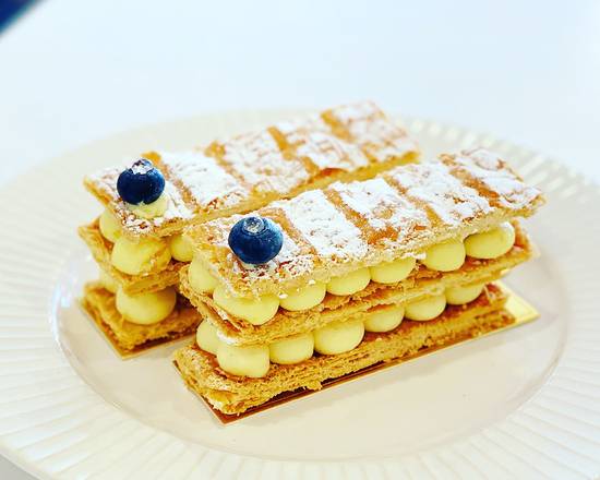 Blueberry flavor- mille-feuille: the crisp layers of puff pastry, which are covered with our special cream filling and blueberry coulis.