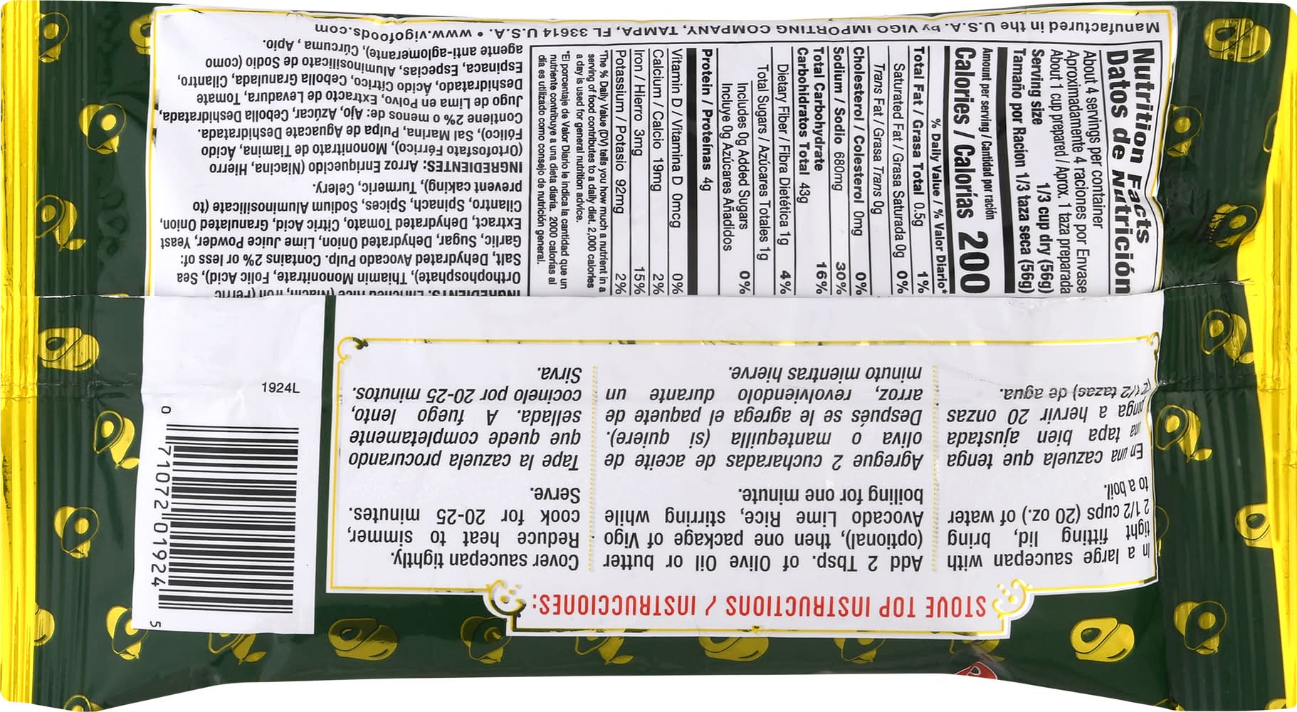Stove top instruction: in a large saucepan with tight fitting lid, bring 2 ½ cups (20oz) of water to a boil. add 2 tbsp. of olive oil or butter (optional), then one package of vigo avocado lime rice, stirring while boiling for one minute. cover saucepan tightly. reduce heat to simmer, cook for 20-25 minutes. serve.