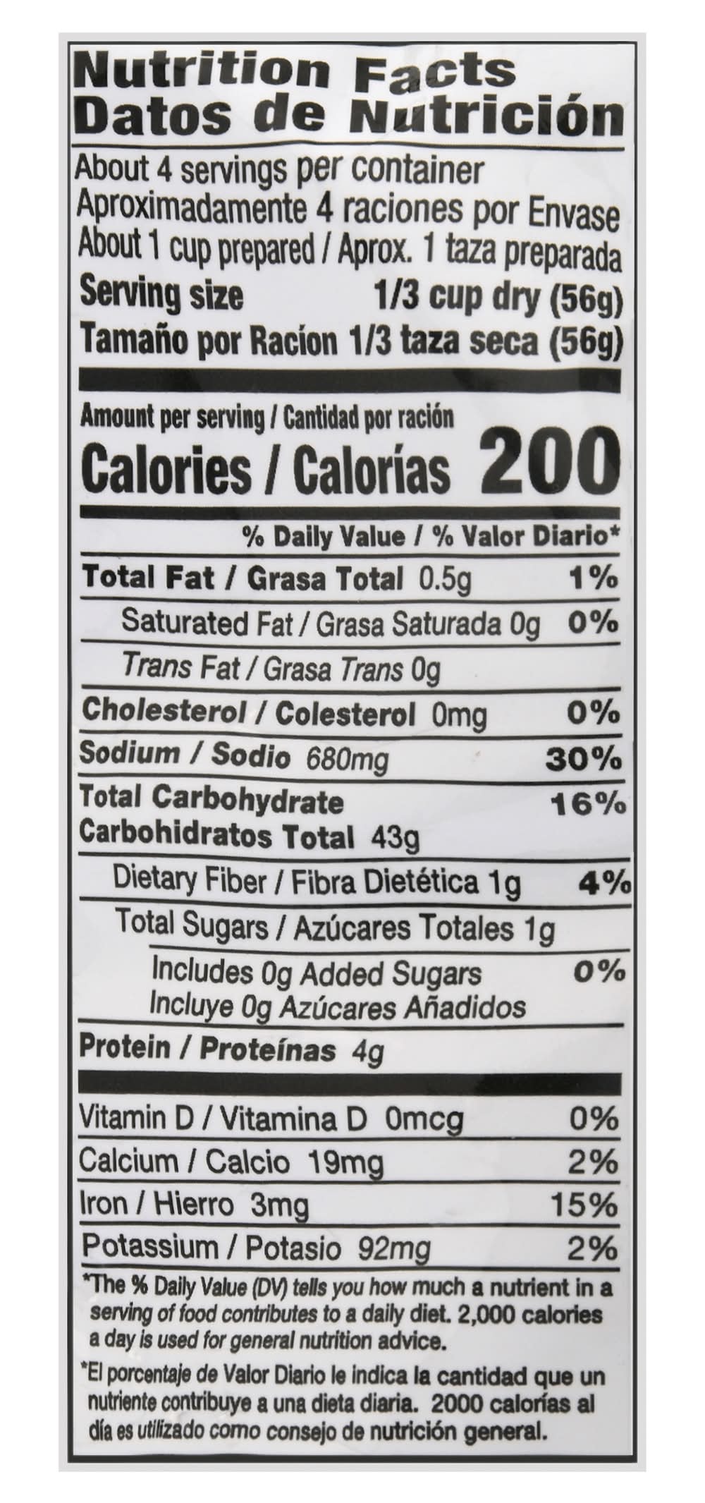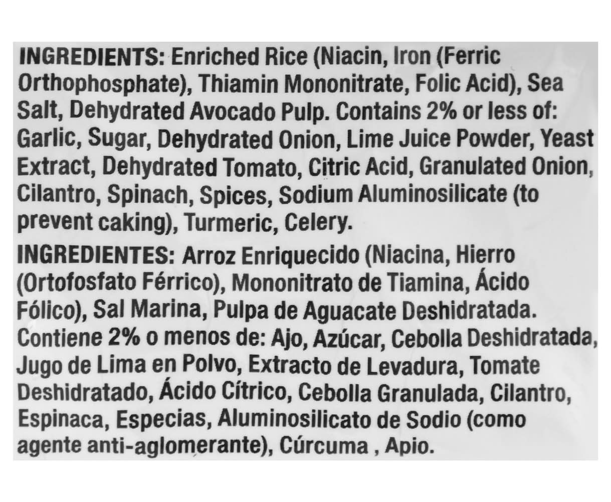 Ingredients: Enriched Rice (Niacin, Iron [Ferric Orthophosphate], Thiamin Mononitrate, Folic Acid), Sea Salt, Dehydrated Avocado Pulp, Contains 2% or Less of: Garlic, Sugar, Dehydrated Onion, Lime Juice Powder, Yeast Extract, Dehydrated Tomato, Citric Acid, Granulated Onion, Cilantro, Spinach, Spices, Sodium Aluminosilicate (to Prevent Caking), Turmeric, Celery