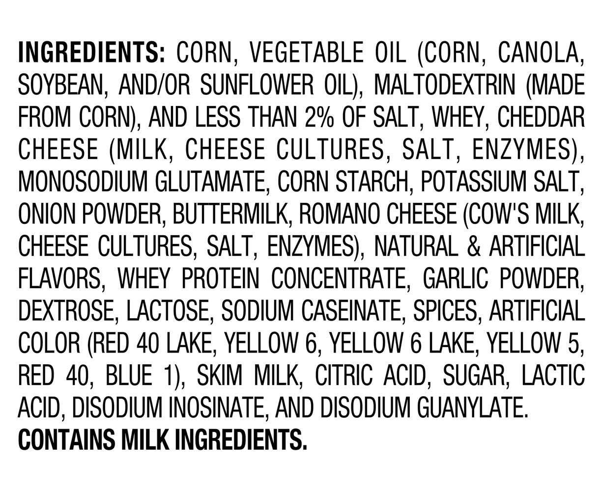 Ingredients: Corn, Vegetable Oil (Corn Canola Soybean and/or Sunflower Oil), Maltodextrin (Made from Corn), and Less than 2% of Salt, Whey, Cheddar Cheese (Milk Cheese Cultures Salt Enzymes), Monosodium Glutamate, Corn Starch, Potassium Salt, Onion Powder, Buttermilk, Romano Cheese (Cow's Milk Cheese Cultures Salt Enzymes), Natural & Artificial Flavors, Whey Protein Concentrate, Garlic Powder, Dextrose, Lactose, Sodium Caseinate, Spices, Artificial Color (Red 40 Lake Yellow 6 Yellow 6 Lake Yellow 5 Red 40 Blue 1), Skim Milk, Citric Acid, Sugar, Lactic Acid, Disodium Inosinate, and Disodium Guanylate Contains: Corn, Milk, Lactose, Soybeans