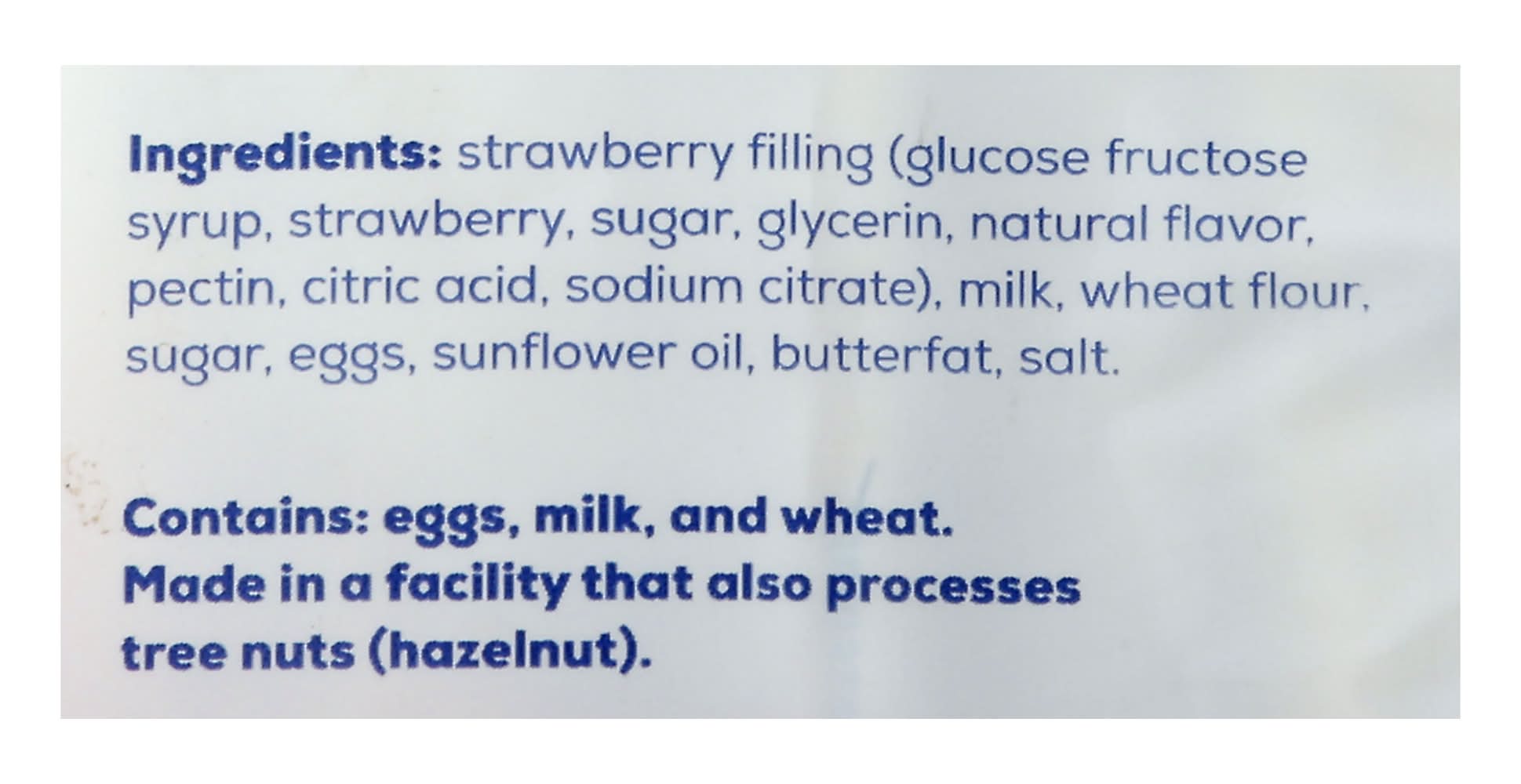 Ingredients: Strawberry Filling (Glucose Fructose Syrup, Strawberry, Sugar, Glycerin, Natural Flavor, Pectin, Citric Acid, Sodium Citrate), Milk, Wheat Flour, Sugar, Eggs, Sunflower Oil, Butterfat, Salt Contains: Eggs, Milk, Wheat, Tree Nuts