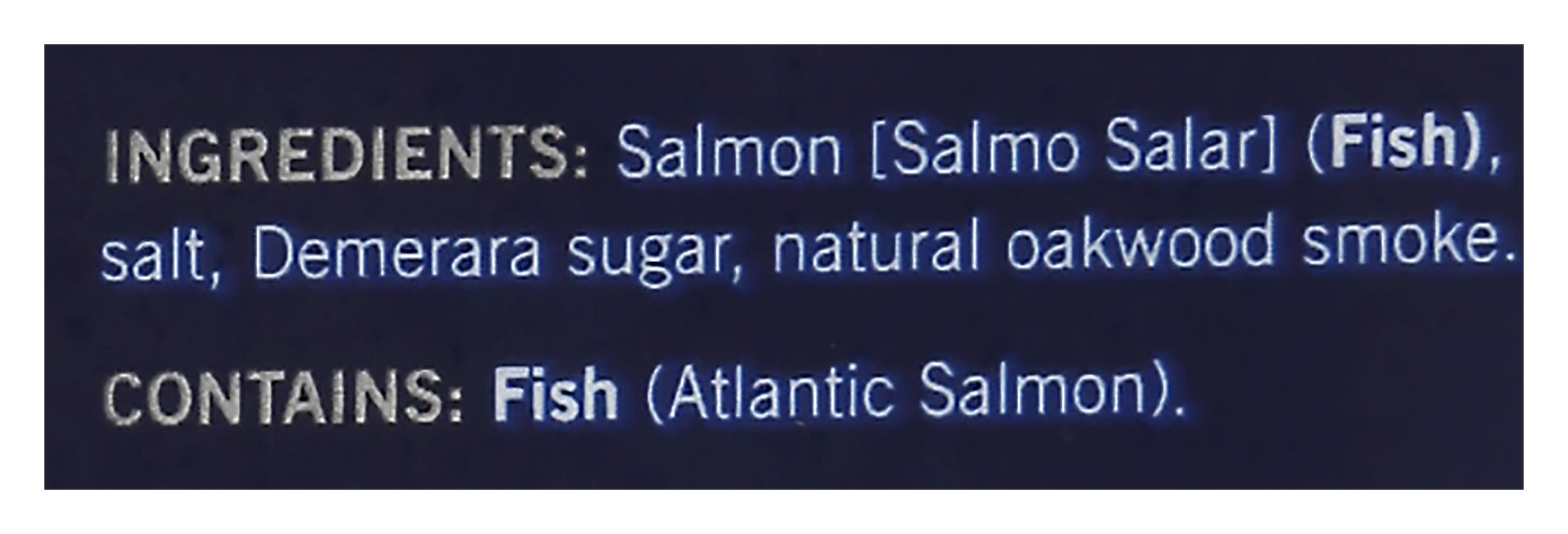 Ingredients: Salmon [Salmo Salar] (Fish), Salt, Demerara Sugar, Natural Oakwood Smoke Contains: Fish