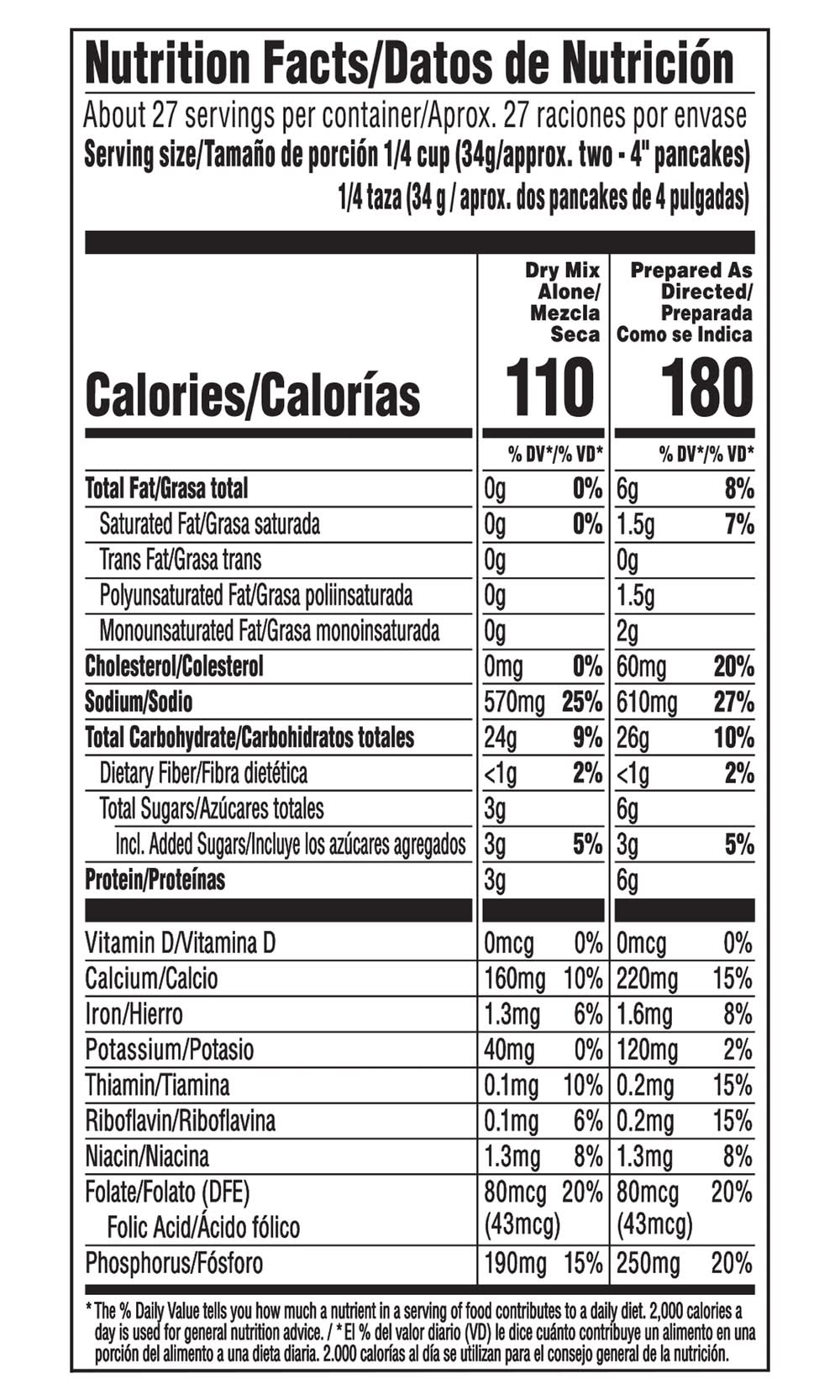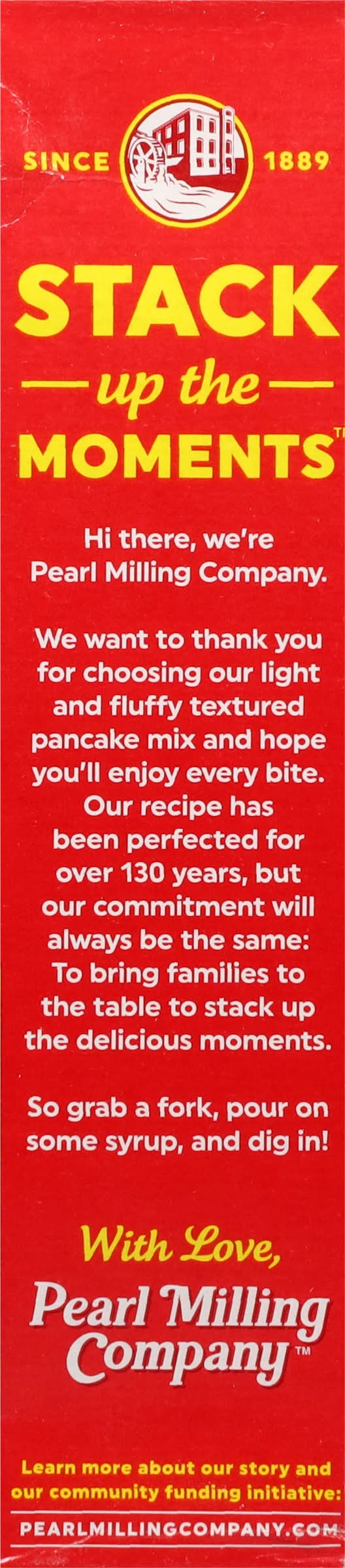Safe handling instructions: pancake mix is made with raw flour so it is not ready-to-eat and must be thoroughly cooked before eating to prevent illness from potential bacteria in the flour. do not eat or play with raw dough; wash hands, utensils, and surfaces after handling. waffles: heat waffle iron. combine 1 cup pearl milling company mix, 3/4 cup milk, 1 egg and 2 tbsp oil; stir until large lumps disappear. for best results, allow batter to rest 4-5 minutes before baking. pour 1/4 cup of batter into lightly greased waffle iron. bake until steaming stops. makes six 4 waffles. pancakes makes 8 four-inch pancakes. 1 cup dry mix, 3/4 cup milk, 1 tbsp oil, 1 egg. 1. heat skillet over medium-low heat or electric griddle to 375 degrees f. 2. combine all ingredients and stir until large lumps disappear (do not beat or over-mix). let stand 1-2 minutes to thicken. 3. pour slightly less than 1/4 cup batter for each pancake onto lightly greased skillet. tip: for golden brown pancakes, use solid shortening instead of oil, butter, or margarine. 4. cook for 90 seconds on first side. turn, and cook for another 60 seconds. tip: for soft and fluffy pancakes, avoid turning them more than once. single serving directions (two 4-in pancakes): use 1/4 cup mix, 3 tbsp milk, 1 egg white, 1/2 tsp oil. to open lift tab and pull. to close tuck red tab in.