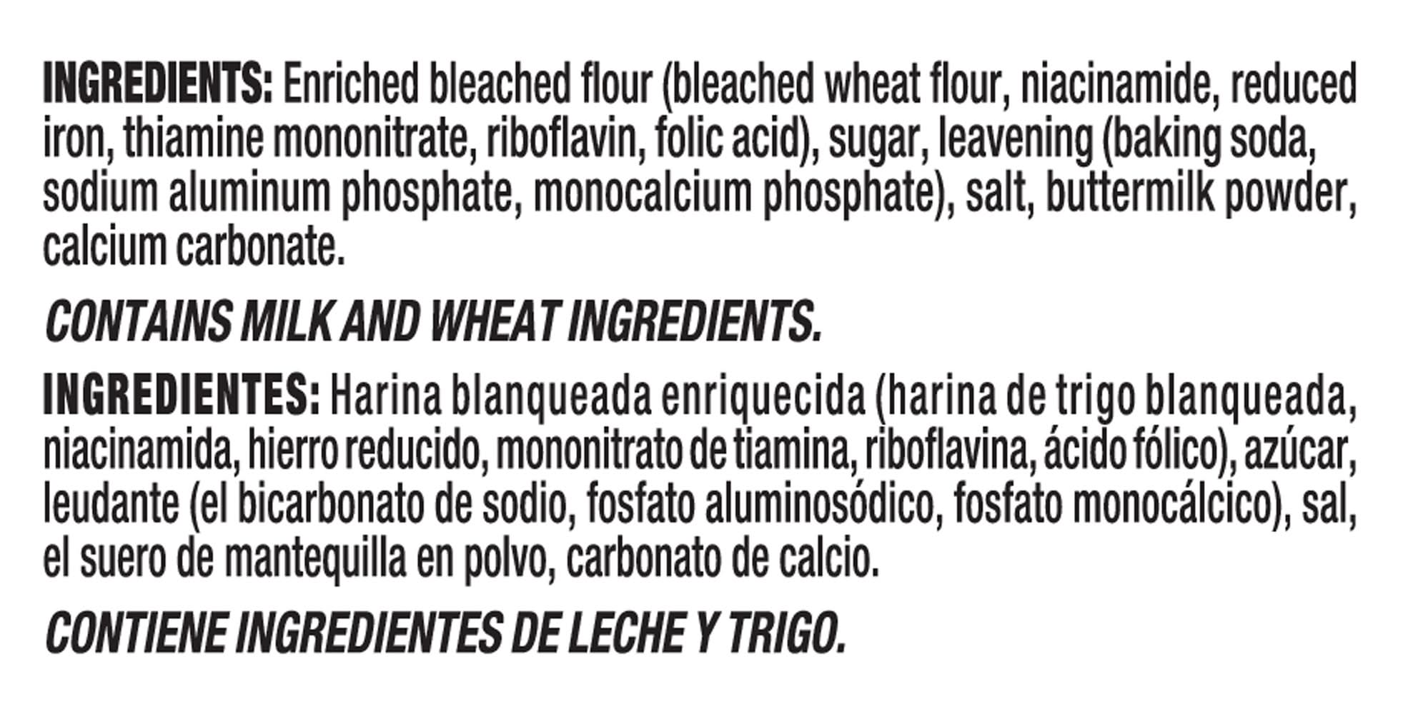 Ingredients: Enriched Bleached Flour (Bleached Wheat Flour, Niacinamide, Reduced Iron, Thiamine Mononitrate, Riboflavin, Folic Acid), Sugar, Leavening (Baking Soda, Sodium Aluminum Phosphate, Monocalcium Phosphate), Salt, Buttermilk Powder, Calcium Carbonate. Contains: Milk, Wheat