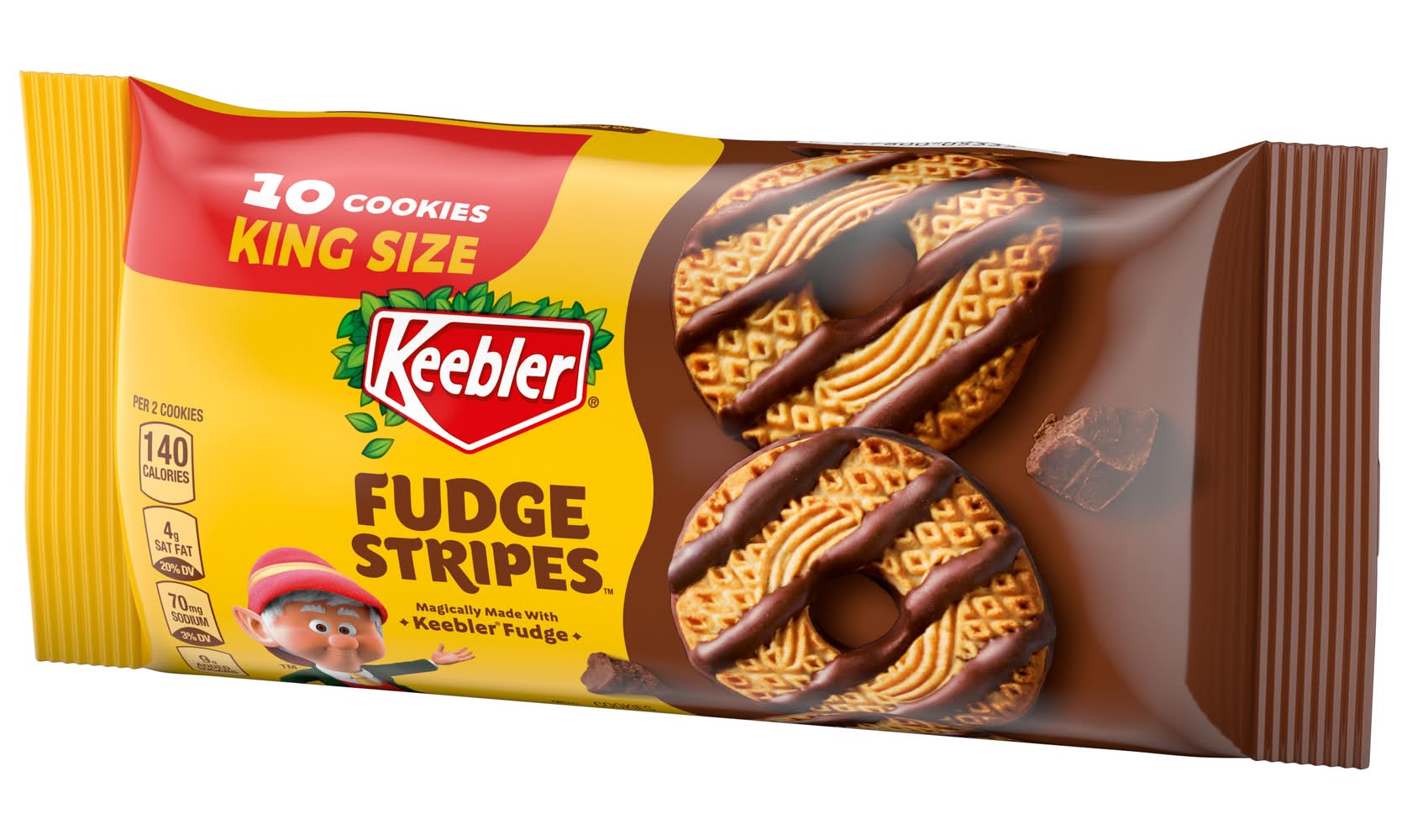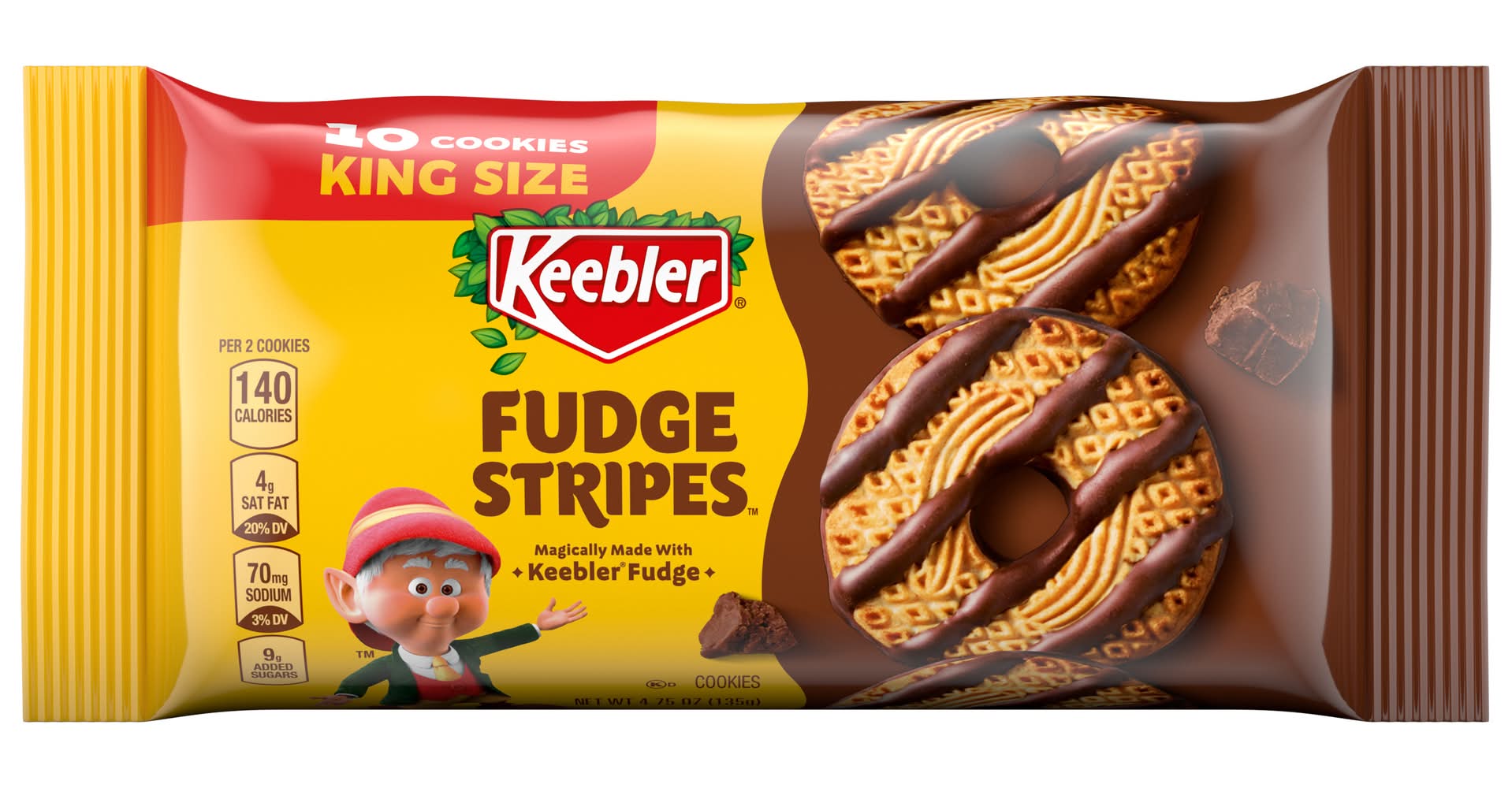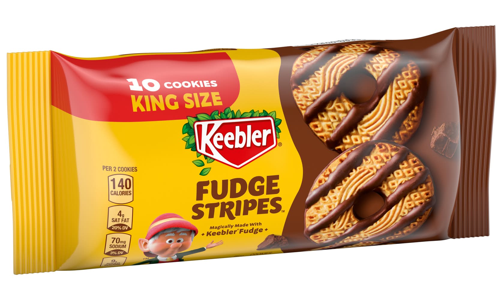 Keebler Fudge Stripes Original Cookies are crafted into a delightful shortbread form and feature a coating of delicious fudge. The cookies are made with real fudge and are presented in a stay-fresh pack, ensuring they maintain their freshness. These cookies are produced by Elves, adding a unique touch to their creation.