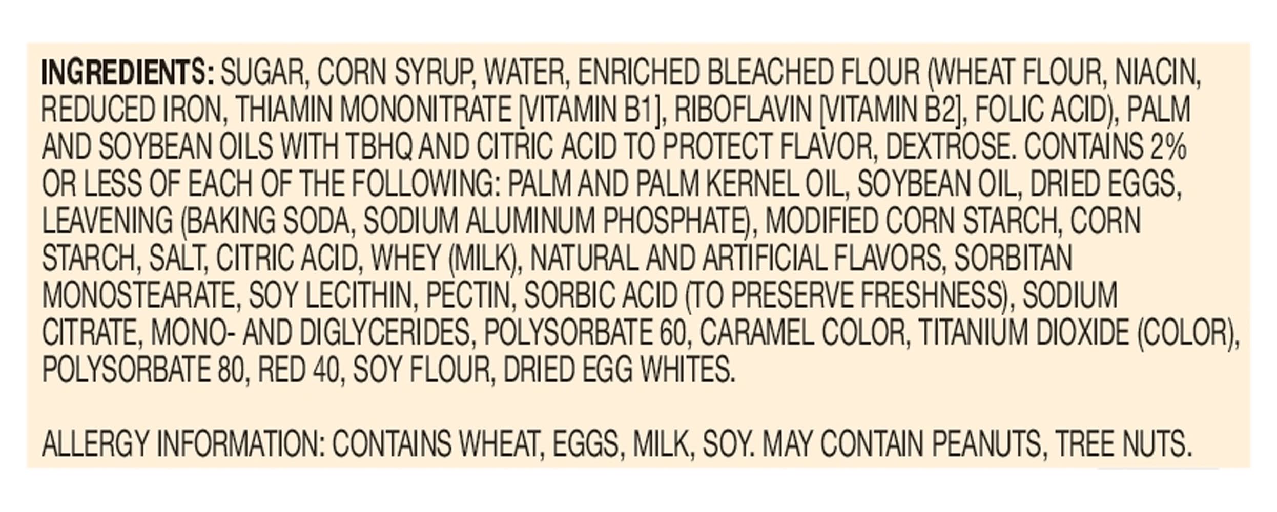 Ingredients: Sugar, Corn Syrup, Water, Enriched Bleached Flour (Wheat Flour, Niacin, Reduced Iron, Thiamin Mononitrate [Vitamin B1], Riboflavin [Vitamin B2], Folic Acid), Palm and Soybean Oils with TBHQ and Citric Acid to Protect Flavor, Dextrose, Contains 2% or Less of Each of the Following: Palm and Palm Kernel Oil, Soybean Oil, Dried Eggs, Leavening (Baking Soda, Sodium Aluminum Phosphate), Modified Corn Starch, Corn Starch, Salt, Citric Acid, Whey (Milk), Natural and Artificial Flavors, Sorbitan Monostearate, Soy Lecithin, Pectin, Sorbic Acid (to Preserve Freshness), Sodium Citrate, Mono- and Diglycerides, Polysorbate 60, Caramel Color, Titanium Dioxide (Color), Polysorbate 80, Red 40, Soy Flour, Dried Egg Whites Contains: Wheat, Soybeans, Eggs, Milk, Peanuts, Tree Nuts