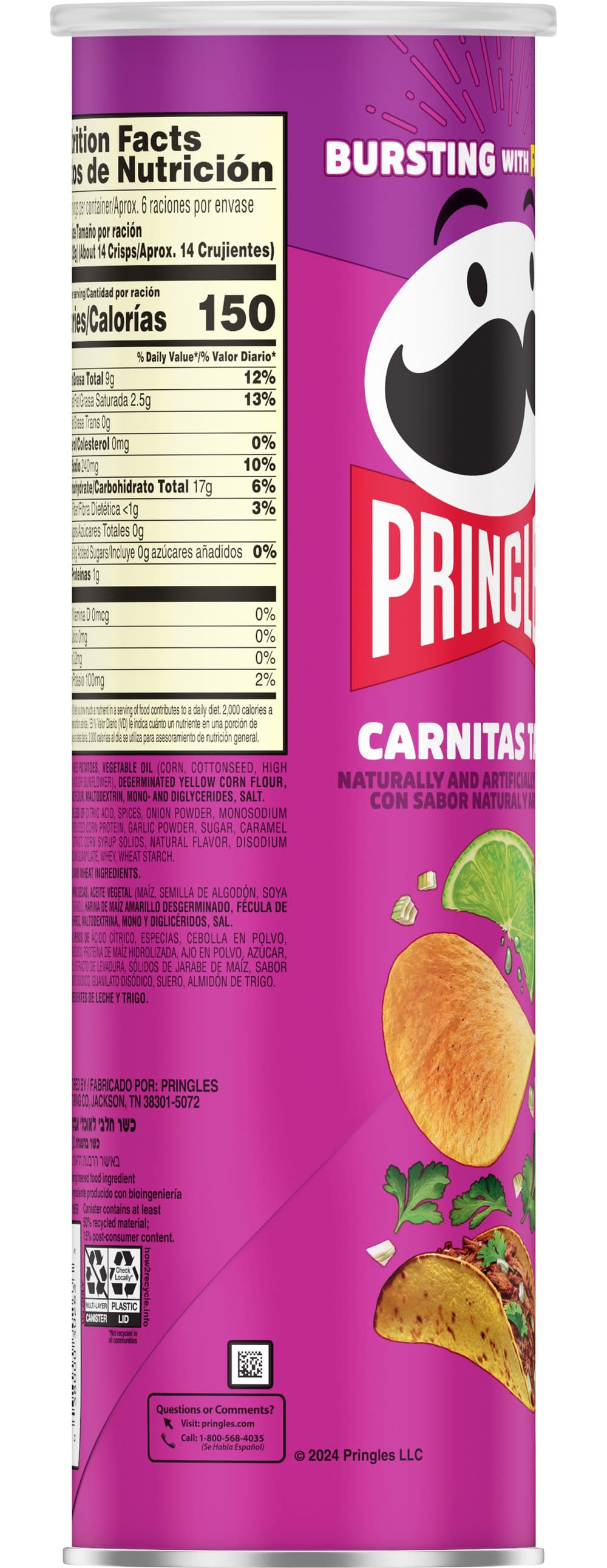 What comes next after the “pop” of a Pringles can? The crisp, crunchy, hit-the-spot taste of potato seasoned with your favorite carnitas taco flavors. Ingeniously shaped Pringles Carnitas Taco potato crisps chips are insanely light, crispy, and never greasy. Perfect for sharing, these crisps are bursting with the savory flavor of pork carnitas and aromatic seasonings including onion, garlic, cumin, and oregano. It's easy to enjoy a carnitas taco without the mess; With this convenient, portable can, it’s easy to create your own snacking moments wherever and whenever. Grab a can as a pick-me-up for after school or pack as the ultimate car snack for road trips. Stash this anytime snack in your work desk or pantry to enjoy anytime. Share Pringles at your next cookout or BBQ to turn up the flavor and fun among family and friends. Get your hands on Pringles Carnitas Taco potato crisps chips for an irresistible taste experience that keeps you coming back, stack after stack.