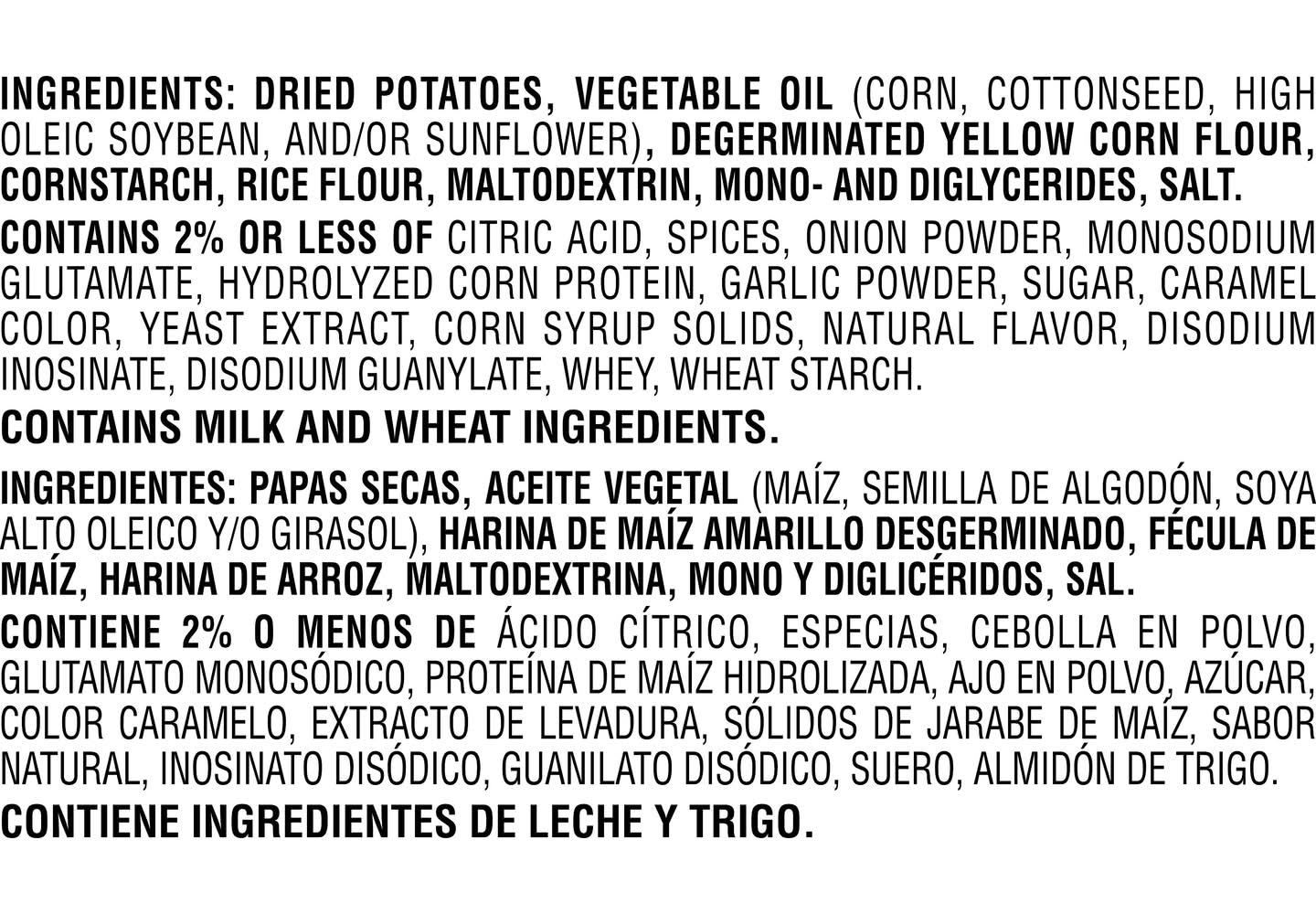 Ingredients: Dried Potatoes, Vegetable Oil (Corn, Cottonseed, High Oleic Soybean, And/Or Sunflower), Degerminated Yellow Corn Flour, Cornstarch, Rice Flour, Maltodextrin, Mono- And Diglycerides, Salt. Contains 2% Or Less Of Citric Acid, Spices, Onion Powder, Monosodium Glutamate, Hydrolyzed Corn Protein, Garlic Powder, Sugar, Caramel Color, Yeast Extract, Corn Syrup Solids, Natural Flavor, Disodium Inosinate, Disodium Guanylate, Whey, Wheat Starch. Contains: Contains milk and wheat ingredients.