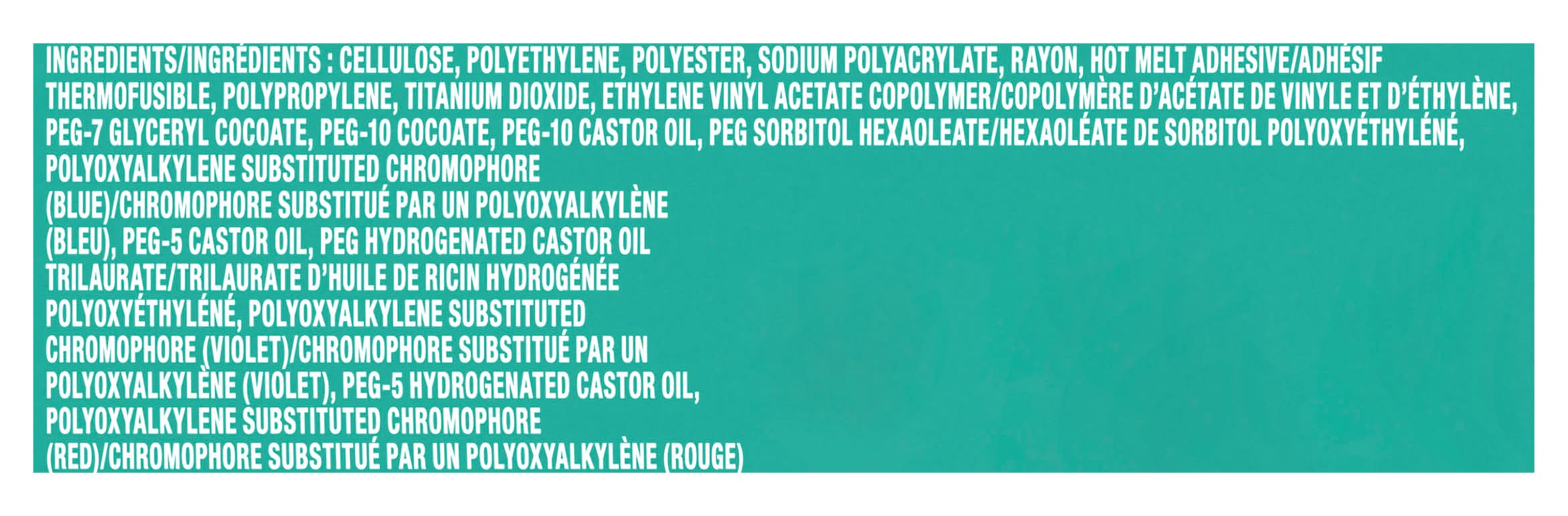 Ingredients: Cellulose, Polyethylene, Polyester, Sodium Polyacrylate, Rayon, Hot Melt Adhesive/Adhesif Thermofusible, Polypropylene, Titanium Dioxide, Ethylene Vinyl Acetate Copolymer/Copolymere D'acetate De Vinyle Et D'ethylene, PEG-7 Glyceryl Cocoate, PEG-10 Cocoate, PEG-10 Castor Oil, PEG Sorbitol Hexaoleate/Hexaoleate De Sorbitol Polyoxyethylene, Polyoxyalkylene Substituted Chromophore (Blue)/Chromophore Substitue Par Un Polyoxyalkylene (Bleu), PEG-5 Castor Oil, PEG Hydrogenated Castor Oil Trilaurate/Trilaurate D'huile De Ricin Hydrogenee Polyoxyethylene, Polyoxyalkylene Substituted Chromophore (Violet)/Chromophore Substitue Par Un Polyoxyalkylene (Violet), PEG-5 Hydrogenated Castor Oil, Polyoxyalkylene Substituted Chromophore (Red)/Chromophore Substitue Par Un Polyoxyalkylene (Rouge)