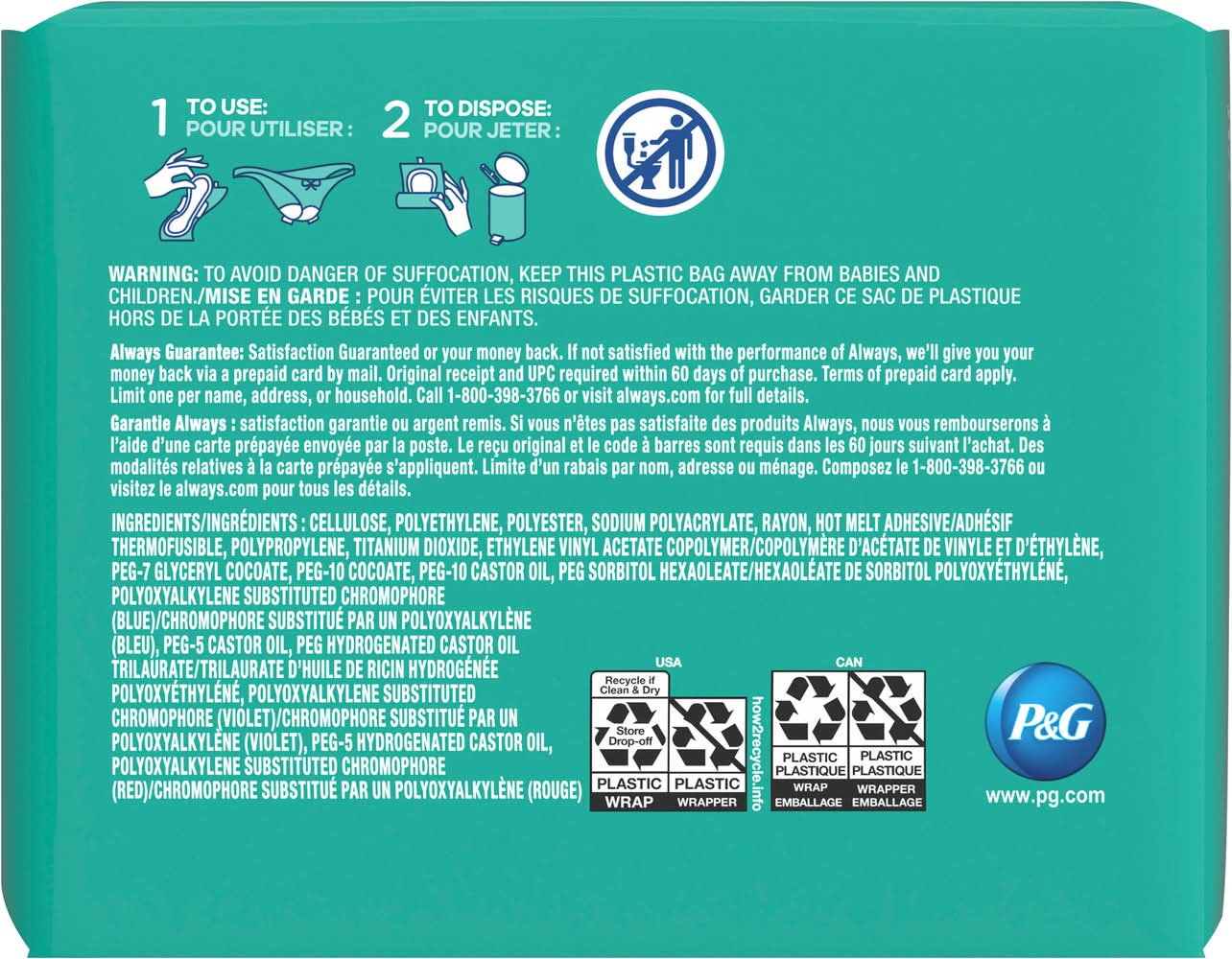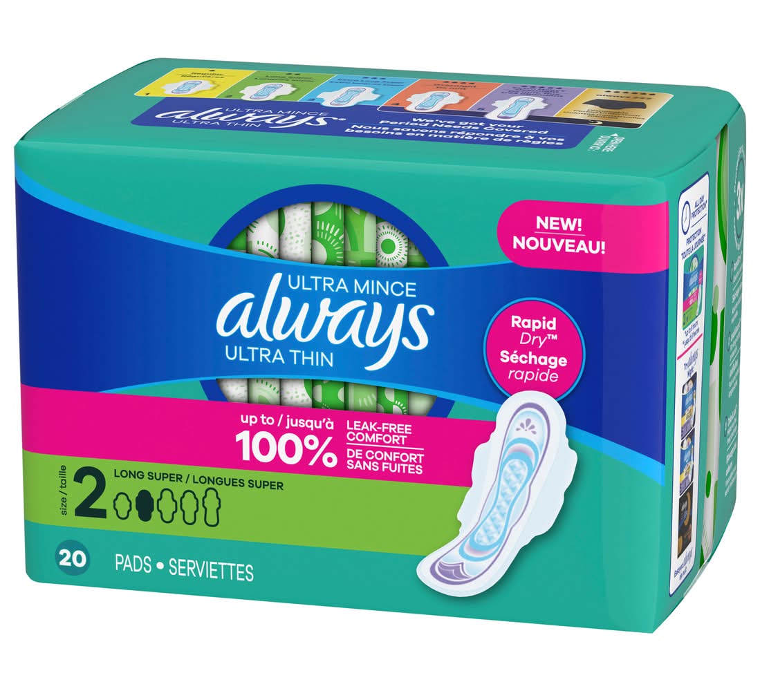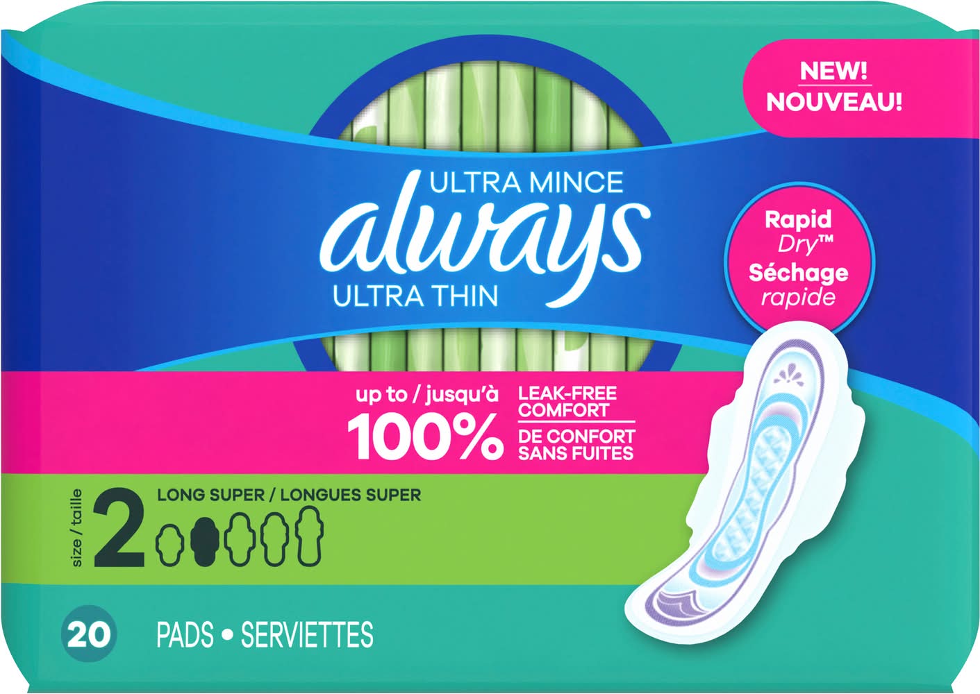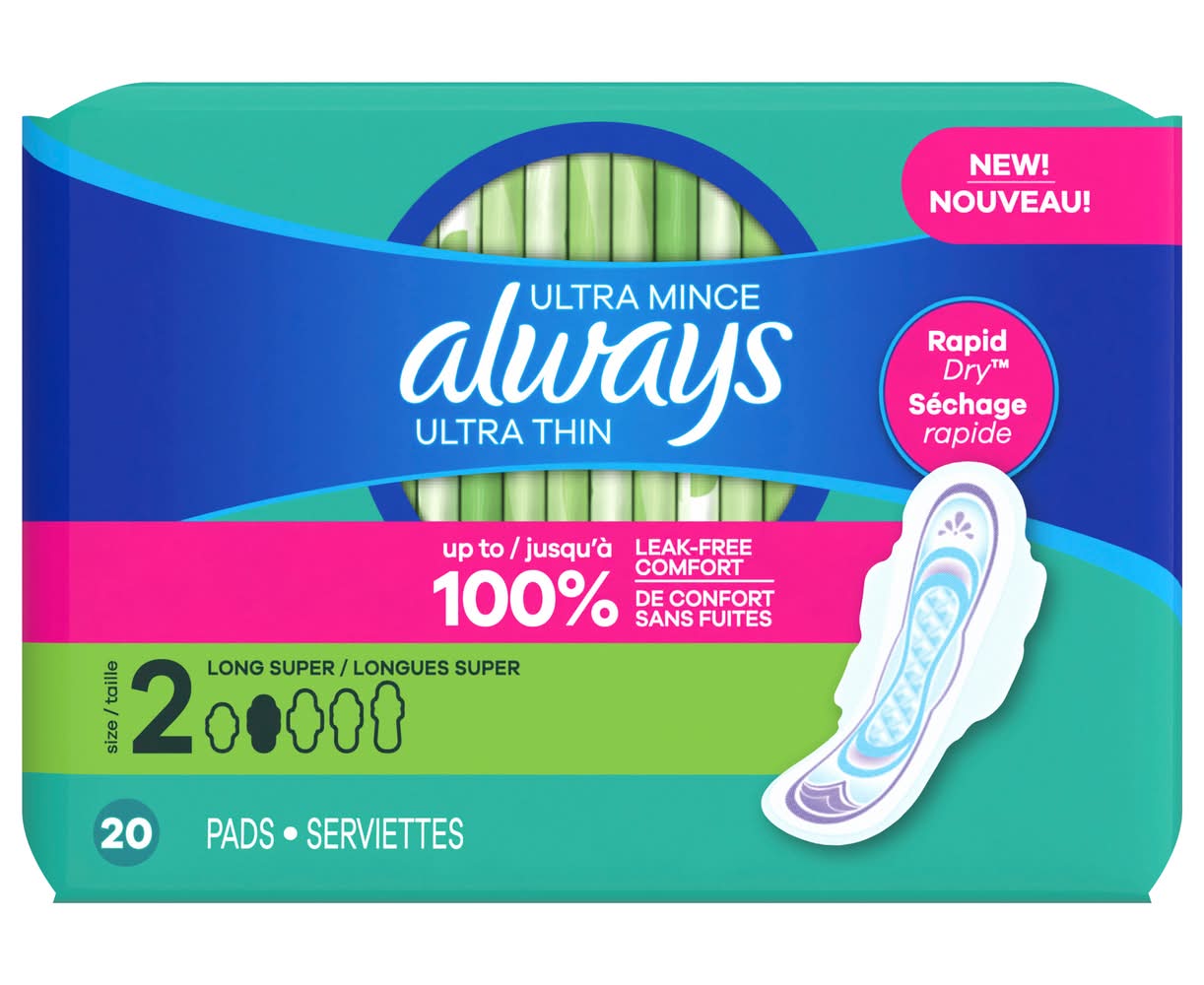 If you think all pads are exactly the same — think again. Discover the completely reinvented Always Ultra pads with 3X Protection System for up to 100% leak-free comfort. Thanks to RapidDRY, the pads absorb two times faster than the leading store brand to wick away gushes in seconds. Plus, the LeakGUARD core locks in leaks for long-lasting protection, while OdorLOCK neutralizes odors to help you feel fresh and clean all day long. Are you getting the right protection from your pad? Did you know that 60% of women are wearing the wrong size pad? Using the wrong pad size can lead to leaks. Step up in size to help stop leaks. Now you can find your fit with Always My Fit, a tailored sizing system to help you find the best protection based on both your flow AND panty size. Use the sizing chart in the images to find your fit for day and night. For daytime protection, Always Ultra Thin Daytime Pads give you 15% better coverage where you need it most* with a flexible design that moves with you, plus a LeakGuard Core that absorbs in seconds for up to 9 hours of protection. *vs. Always Ultra Thin Regular with Flexi-Wings Size: 2