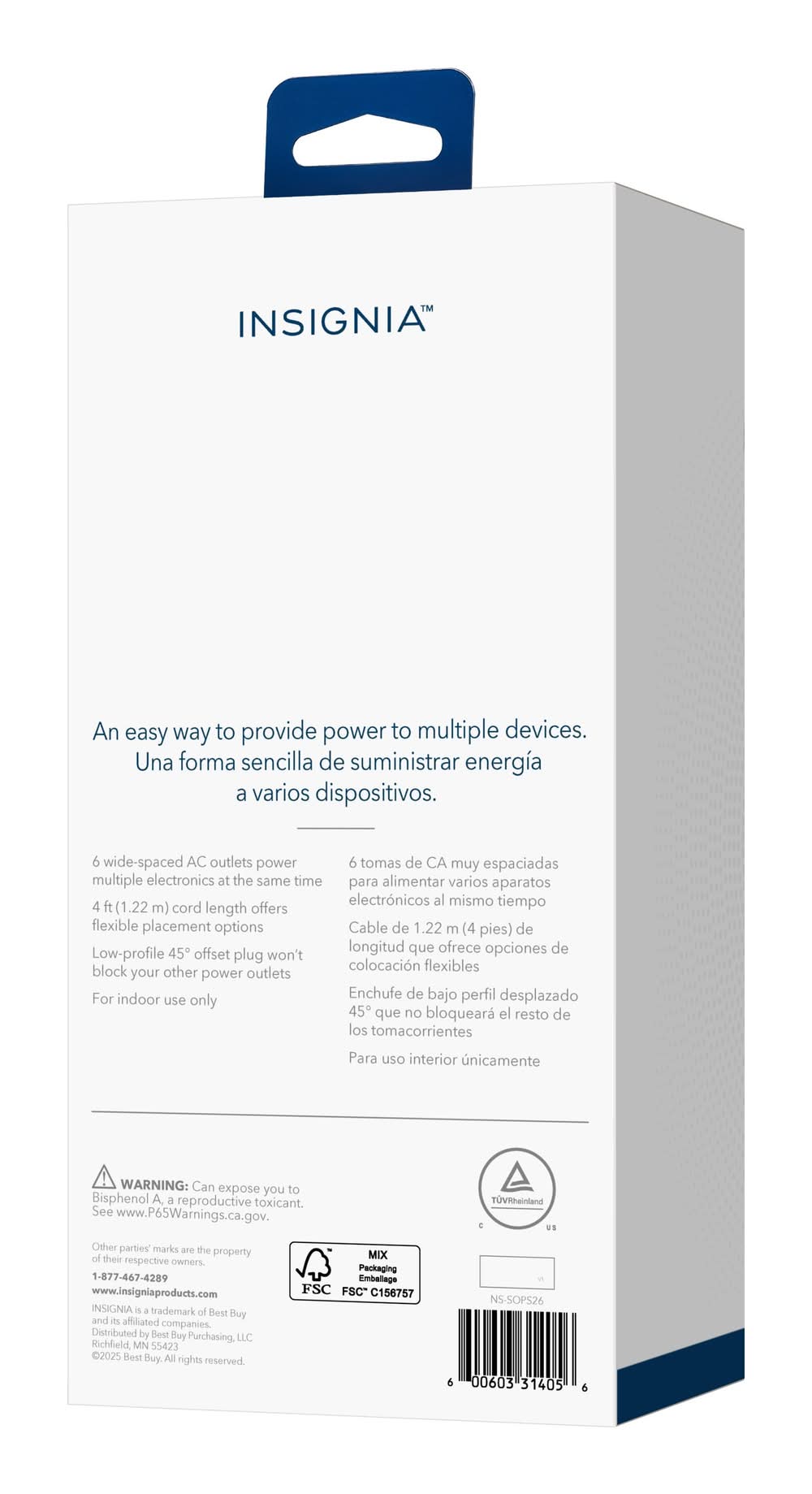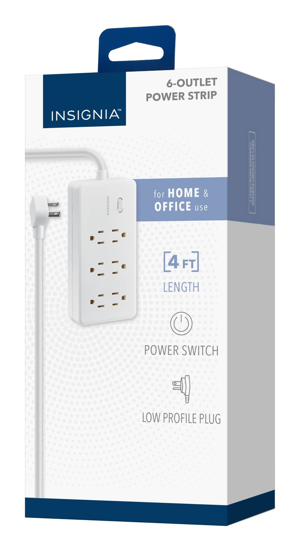 Turn an inaccessible outlet into a multi-device charging station with the Insignia 4’ 6 Outlet Power Strip with Power Switch. The power strip features a 4 ft. cord with a low-profile plug that handles tight quarters with ease. It can be placed on a desktop with its non-slip feet or mounted to the wall, providing easy access to its six wide-spaced AC outlets and the power switch. Color: White