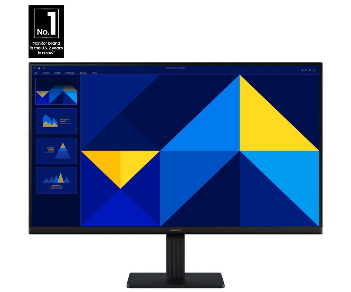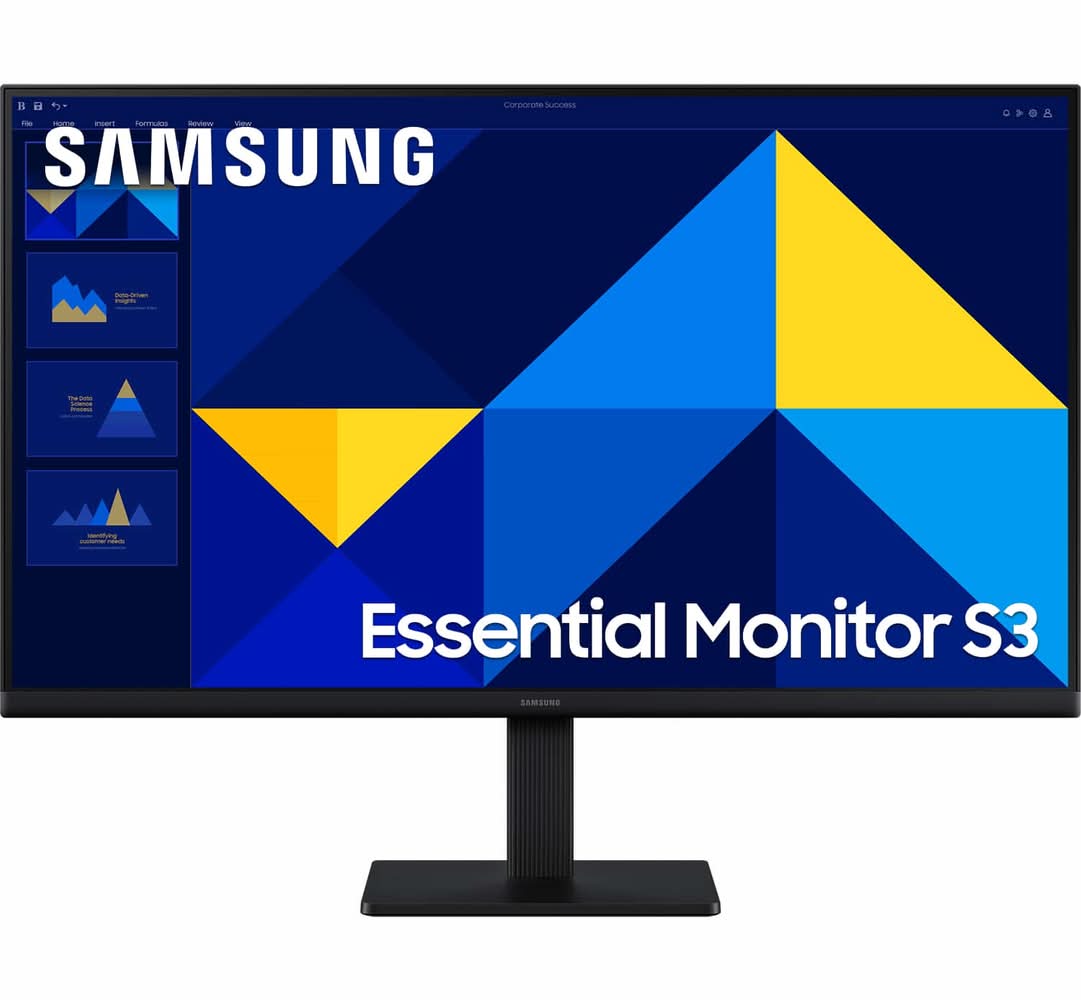 Samsung’s 27" S3 Monitor enables smooth performance, heightened productivity, and greater comfort. The IPS Panel delivers a stunning color experience across the entire display with less color washing, offering clarity from any viewpoint so tones stay consistent and accurate. The 100Hz refresh rate reduces lag and motion blur while playing games, watching videos, or working. Game Picture Mode with optimizable game settings enables instant adjustment of color and image contrast. Eye Saver Mode protects vision, reduces blue light and screen flicker, and extends comfort even during long sessions. The ergonomic super-slim design is a stylish addition to any environment, while ultra-thin border bezels make the most of screen space. Multiple connectivity enables devices to be plugged straight into the monitor for increased flexibility. Color: Black
